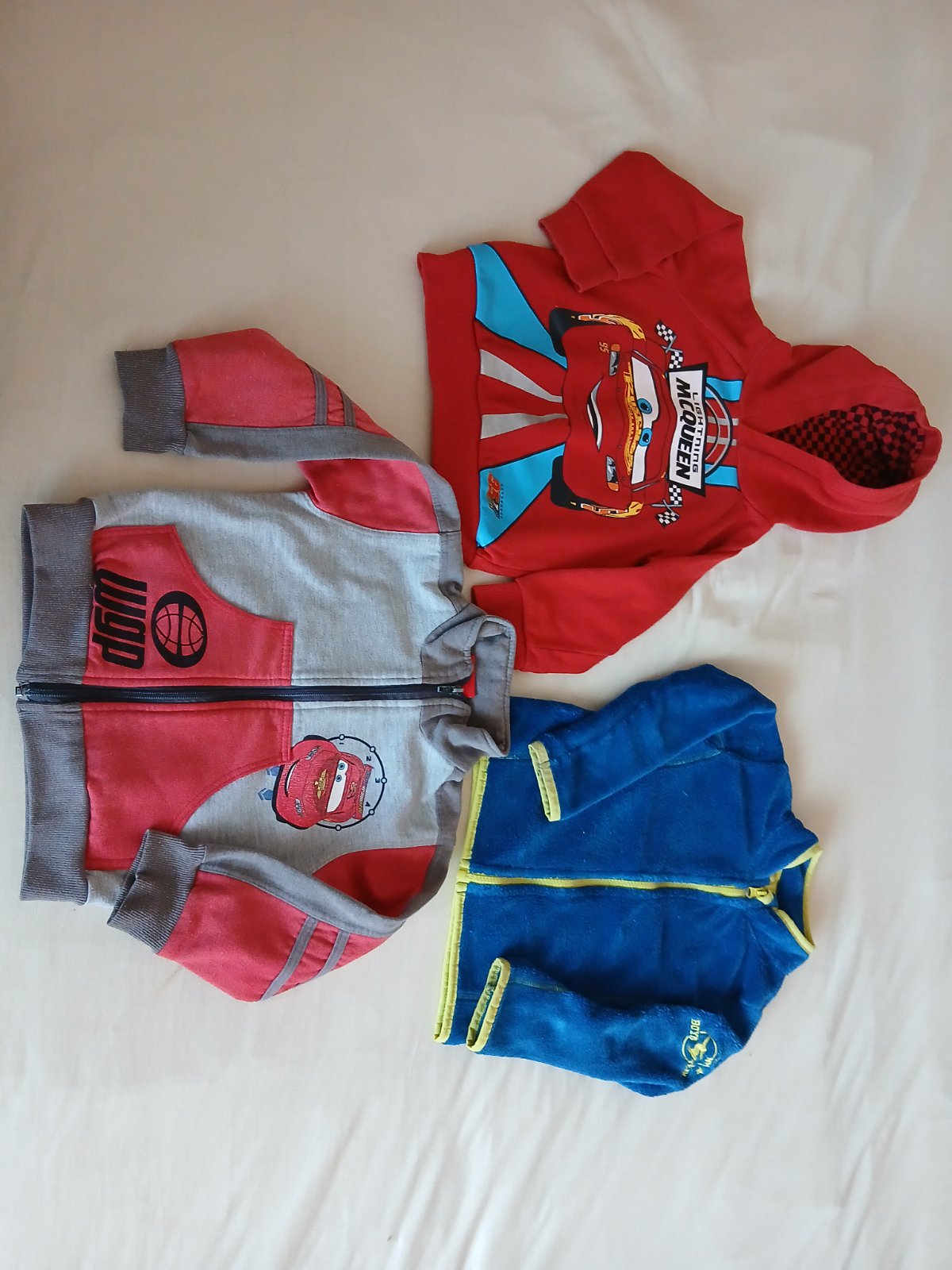 3 mikiny, červená cez hlavu s kapucňou, modrá a cerveno šedá na zips.
