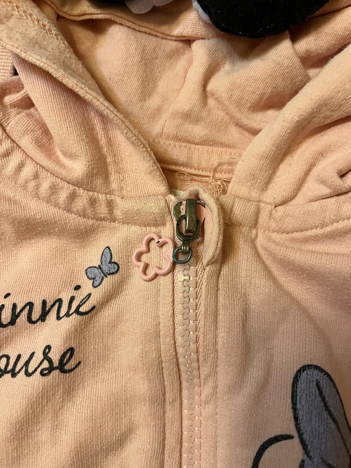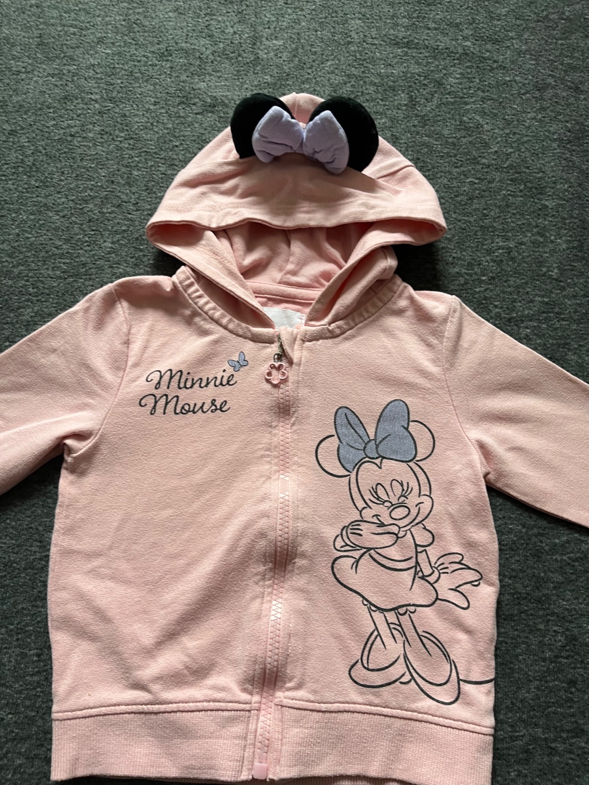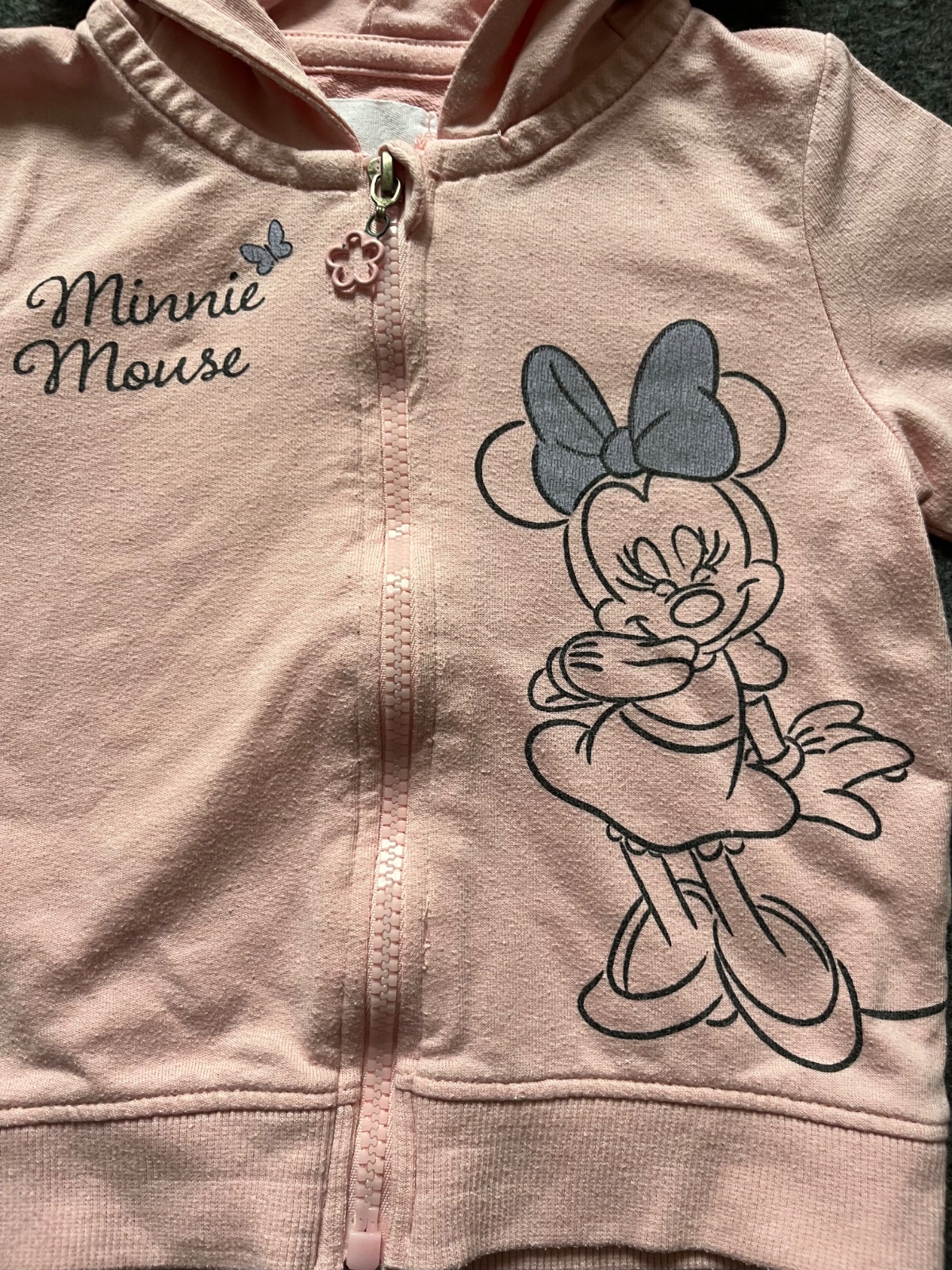 Nosená no stále veľmi pekná mikina Minnie. Bez poškodení, maximálne jemný prací chĺpok a na zopár je vydraná farba trošku. Obrázok nepopukaný, nepoškodený. Veľkosť 80