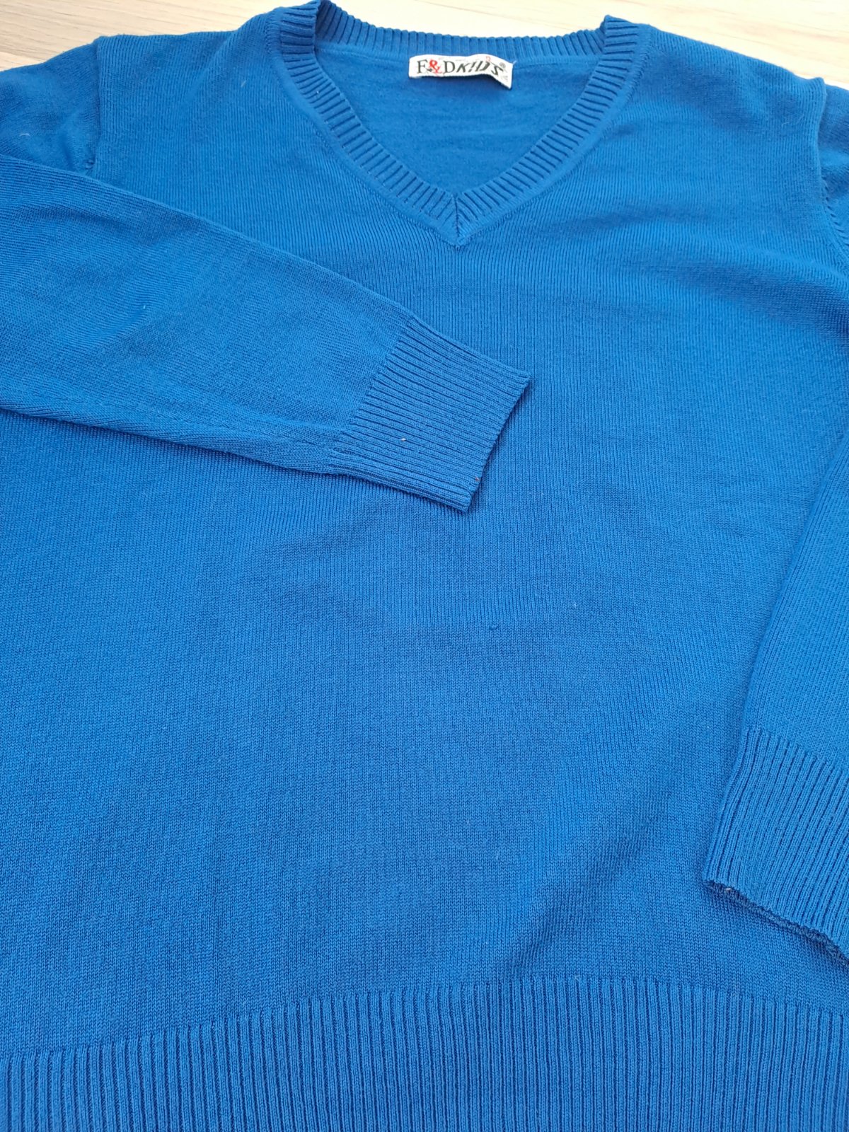 Pekný chlapčenský svetrík. Farba sýta modrá. Svetrík má vzadu zatiahnute nitky (viď. foto). Možno sa to dá spraviť. Inak je v poriadku. Veľ. 158.