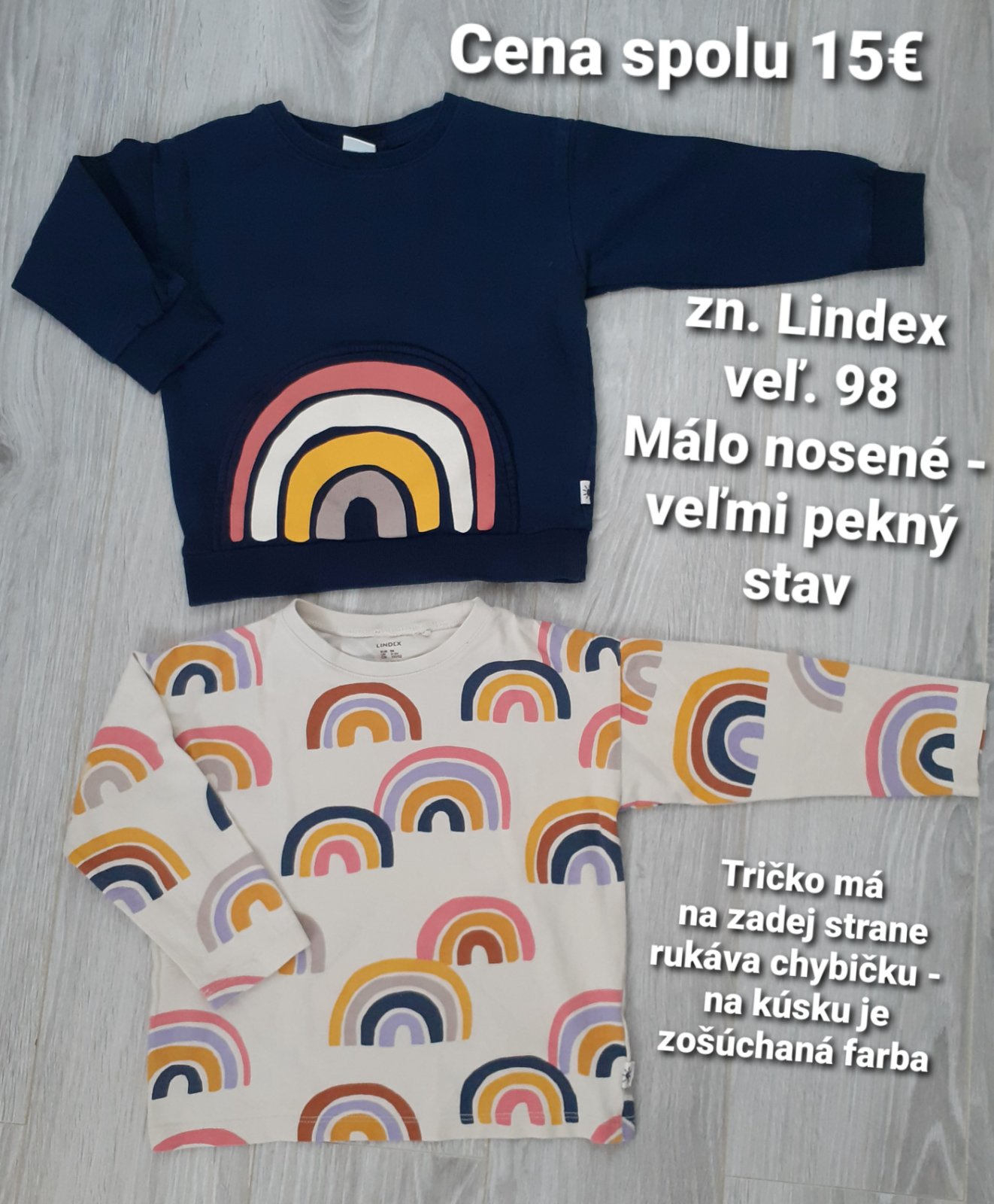 Málo nosené - veľmi pekný stav, len tričko má na zadnej strane rukáva zošuchnutý kúsok farby (viď. foto). Mikina nevyblednutá. Cena spolu. Dúhy. Značka Lindex. Veľkosť 98.