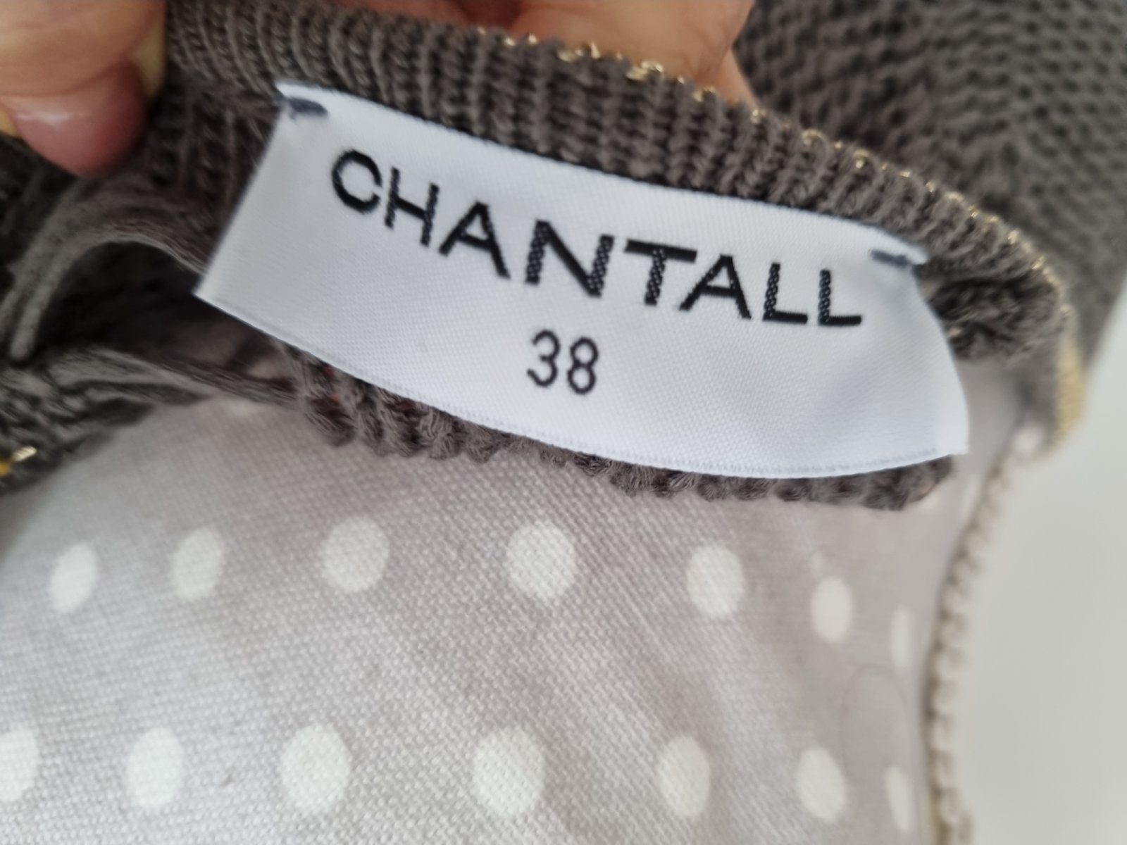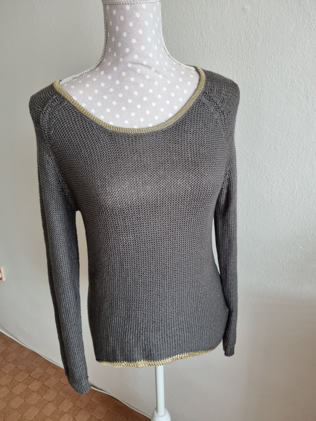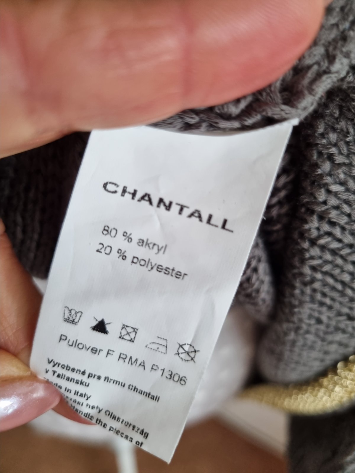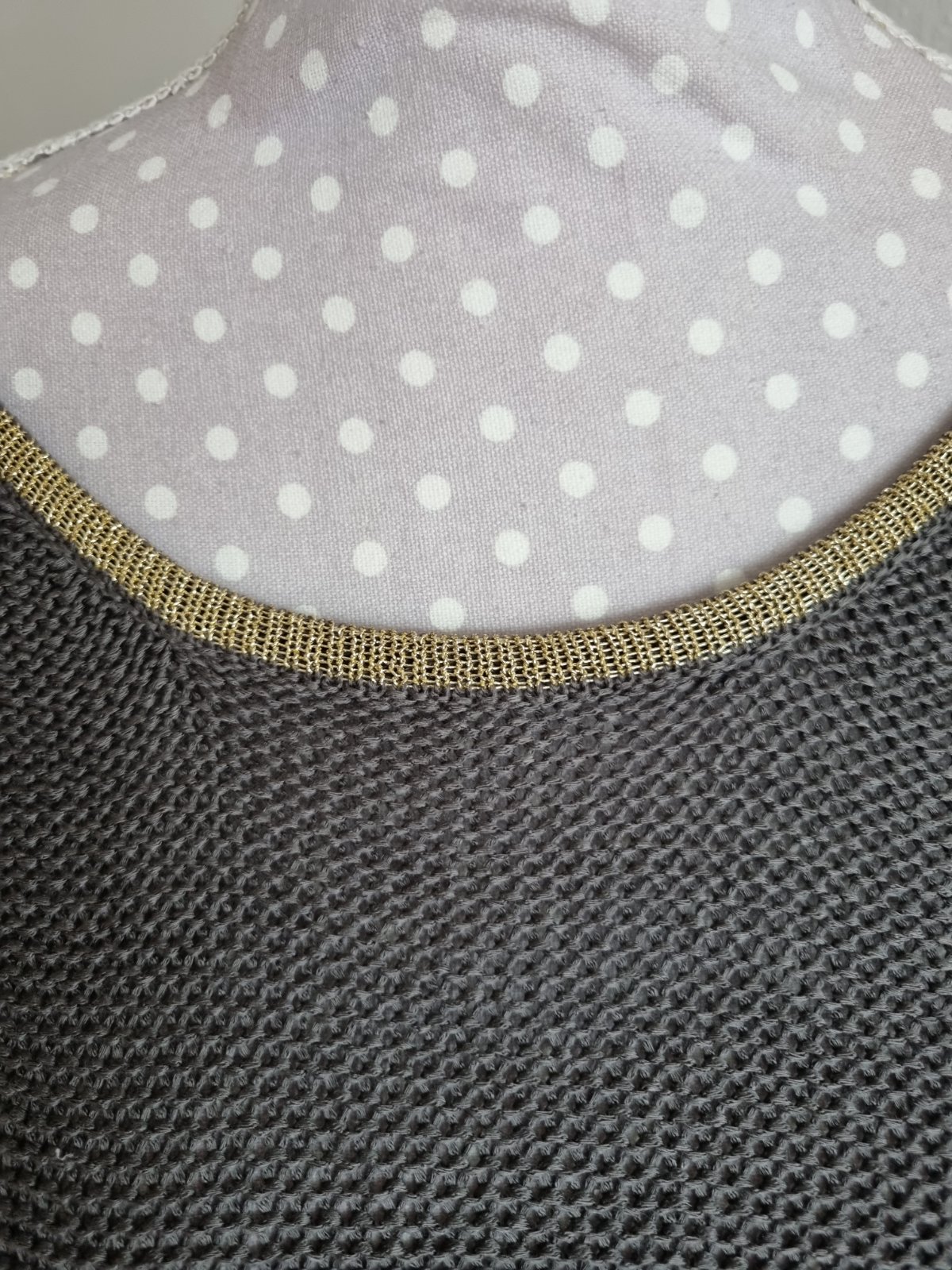 sivý so zlatými lemami...vzadu dierkový vzor.....dĺžka vpredu 61 ) predný diel je mierne do oblúčka ) ..vzadu 69..rukav od krku 71..prsia 47x2, zloženie na štítku