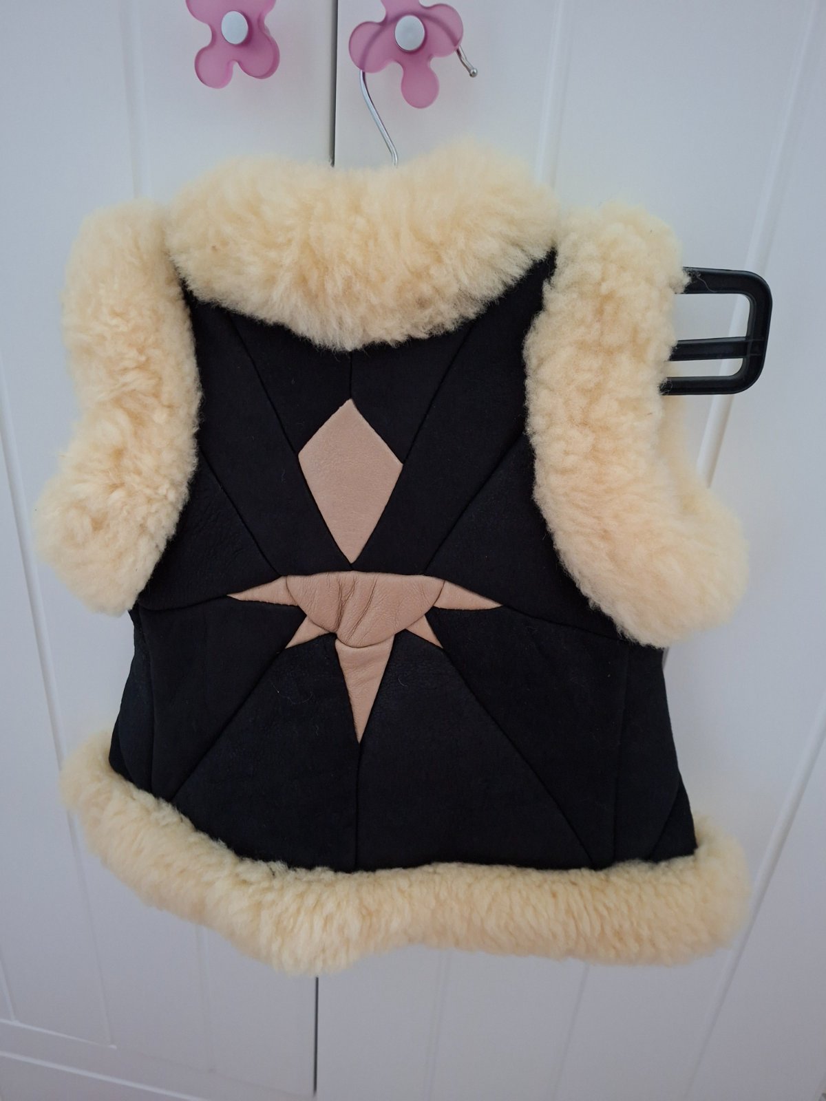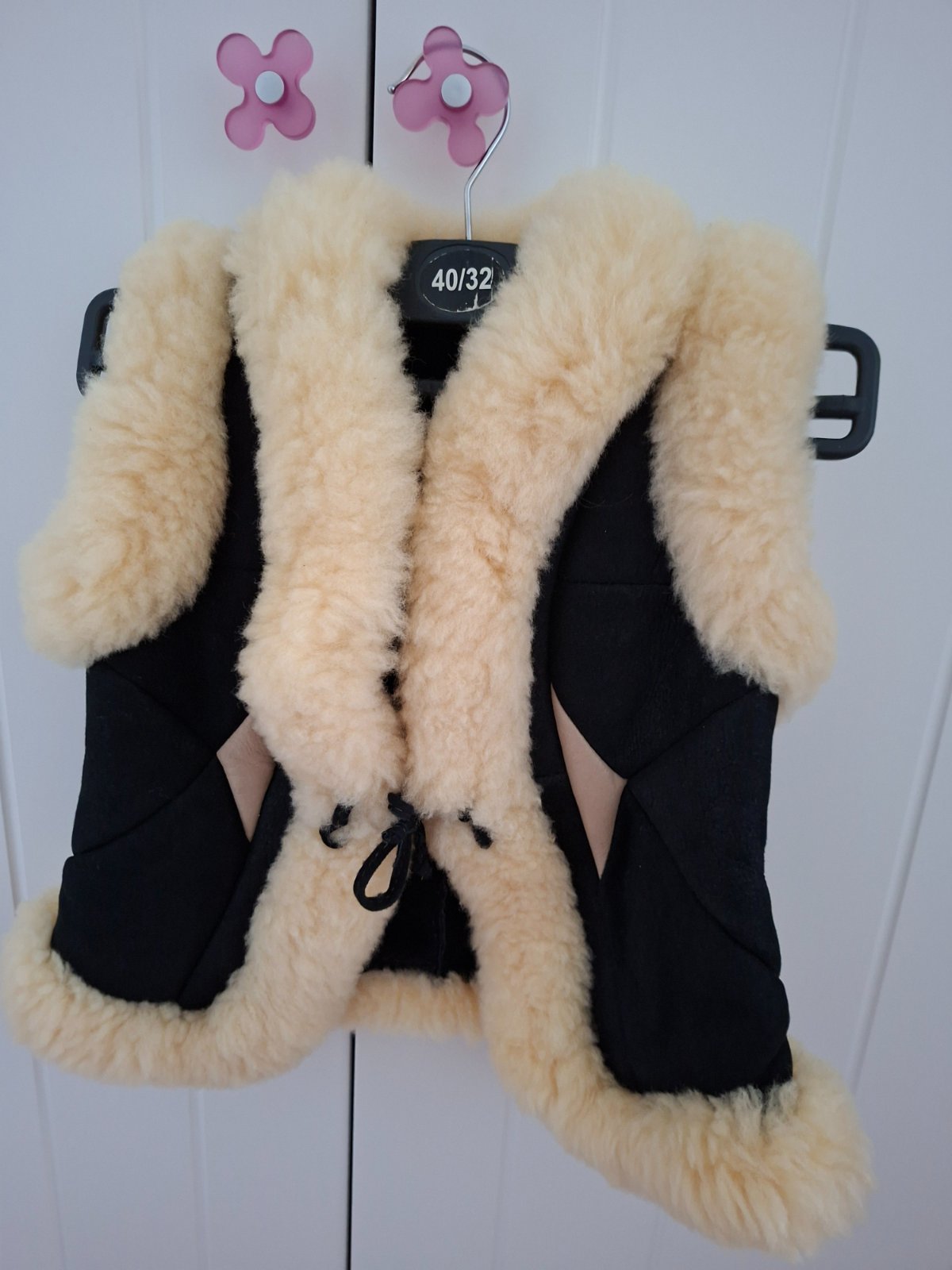 Kožušinková vesta teplá so zaväzovaním vpredu. Celková šírka na hrudníku je cca. 30cm a celková dĺžka cca. 38cm. Dcéra nosila vo veku 4 rokov. Nosená minimálne.