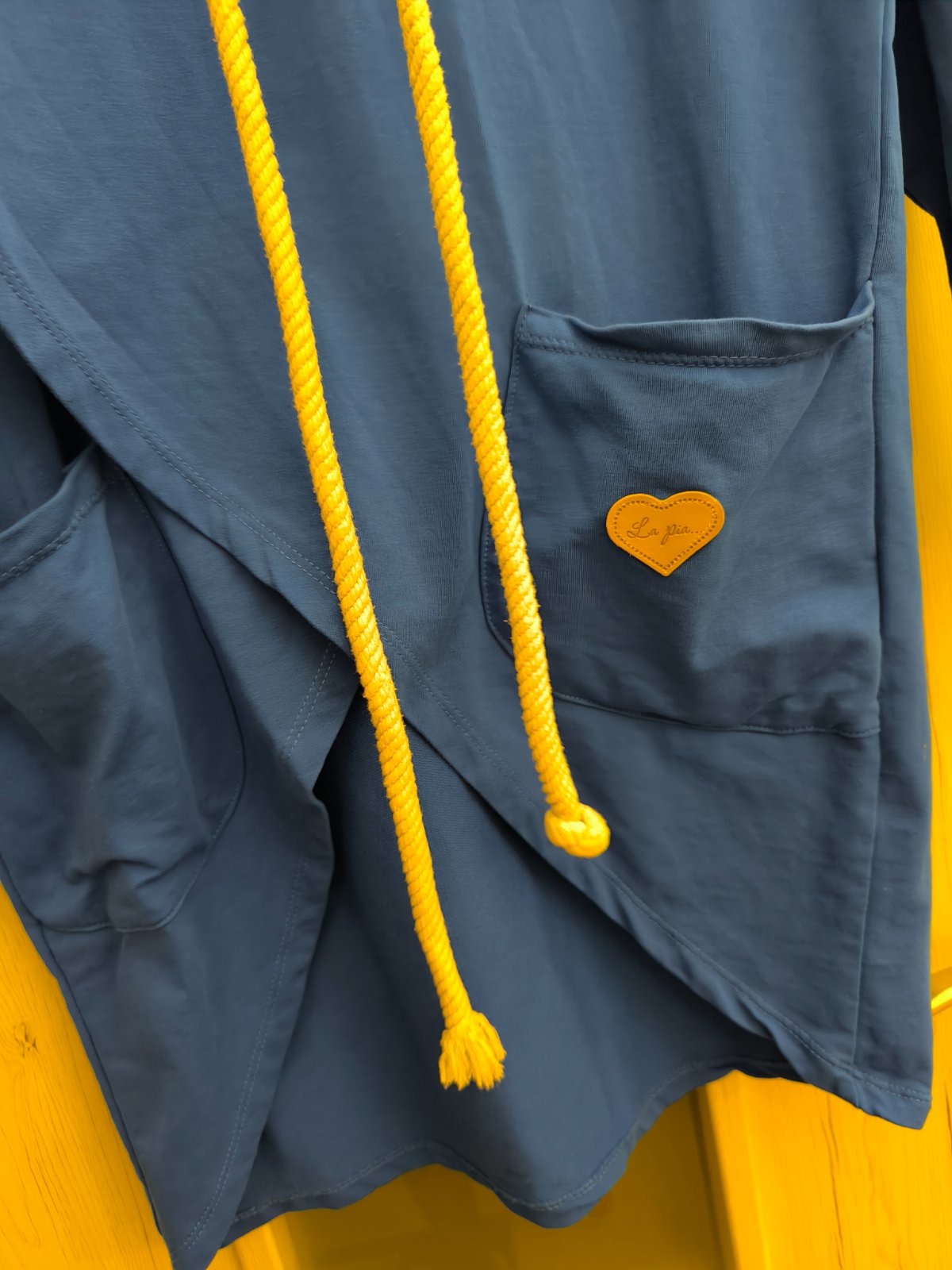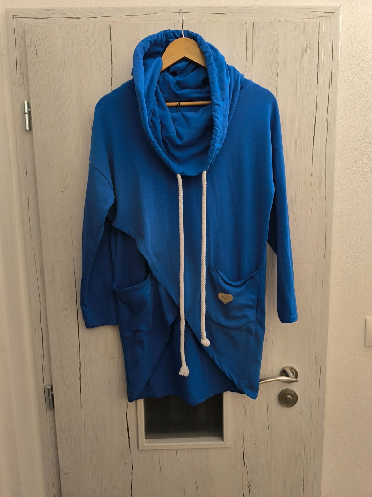 Krásna modrá mikina, veľkosť písaná štandard, takže nejaké S/M. Zaujímavý strih.