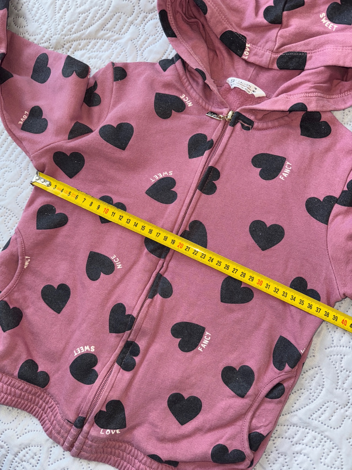 Veľmi pekná tmavoruzova mikina, čierne srdiečka sa trosku trblietaju, kvalitná, teplejsia vnutri, trosku viac do pasu strih, veľkosť do 146 sedí. Výborný stav.