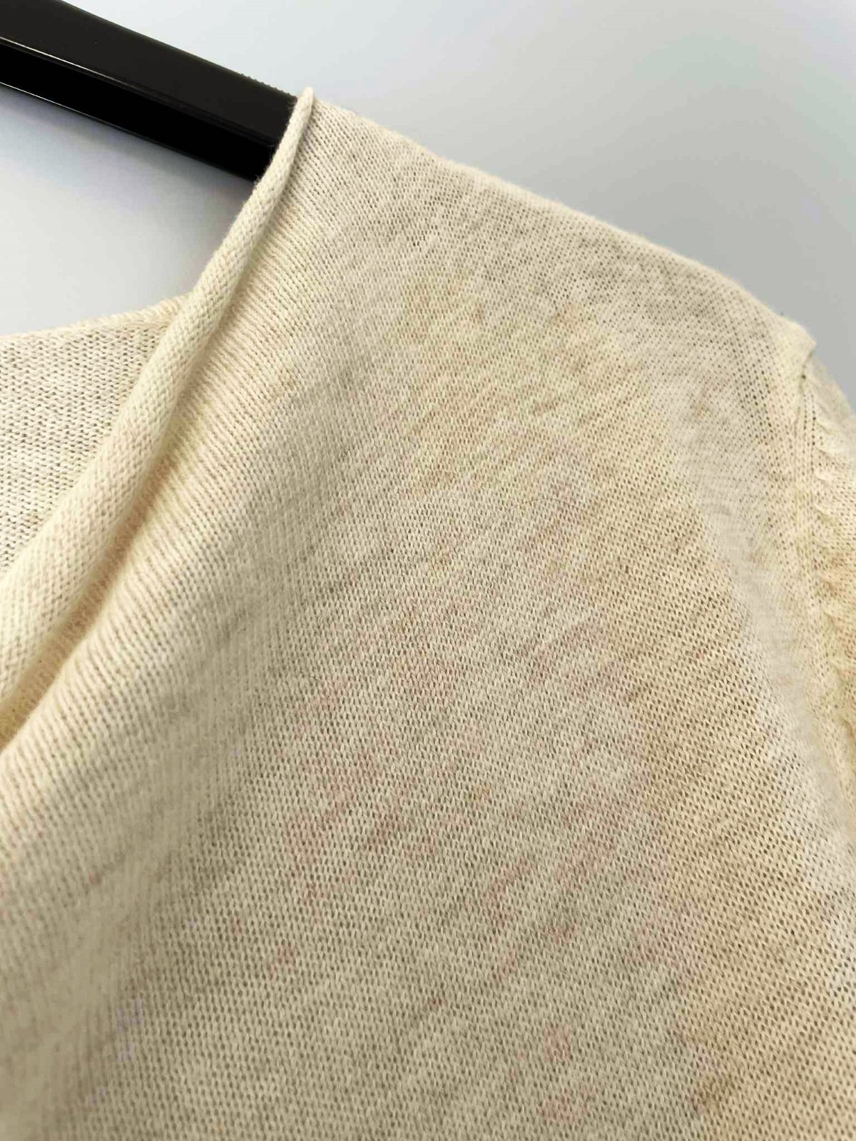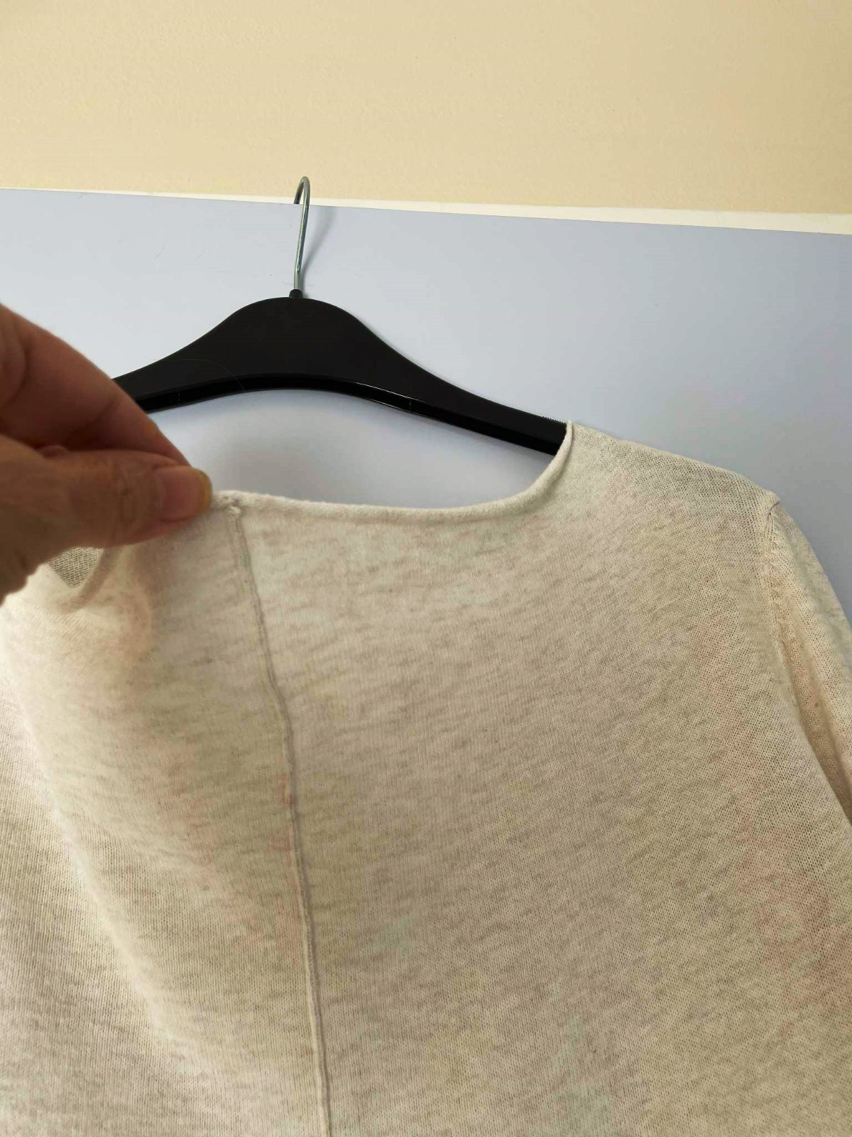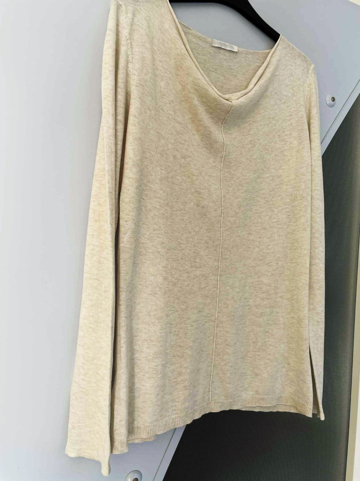 jemný tenký - jemne striekaný značkový pulóvrik,v strede prešitý - ako puky na nohaviciach,výstrih krásne padá,neznosený, v top stave a kvalite,dlžka celkom = 67 cm, dlžka od pazuchy dole = 46 cm, rukáv = 66 cm,ramená = 8 cm,šírka meraná pod pazuchou = 52/53 x 2 cm