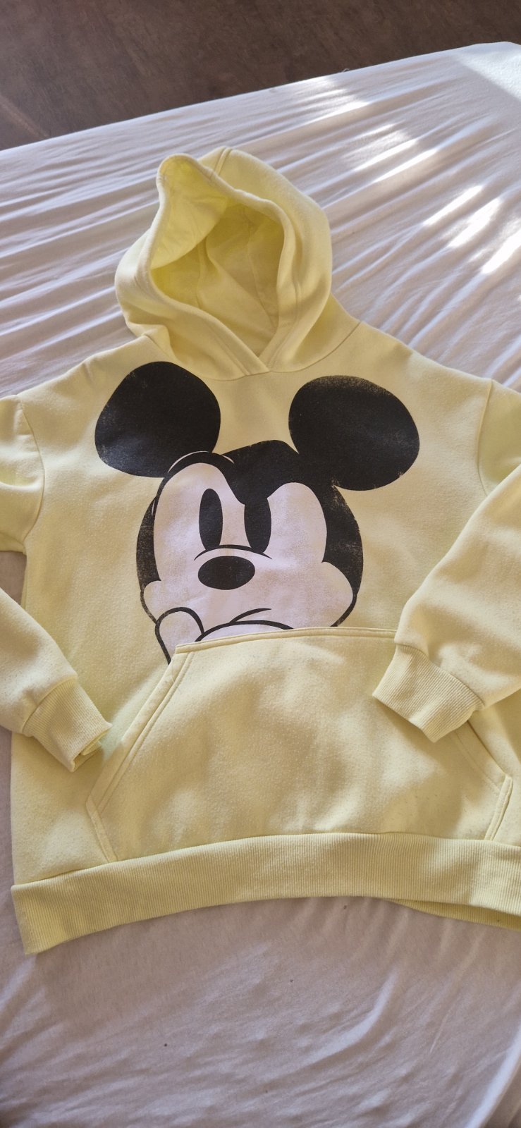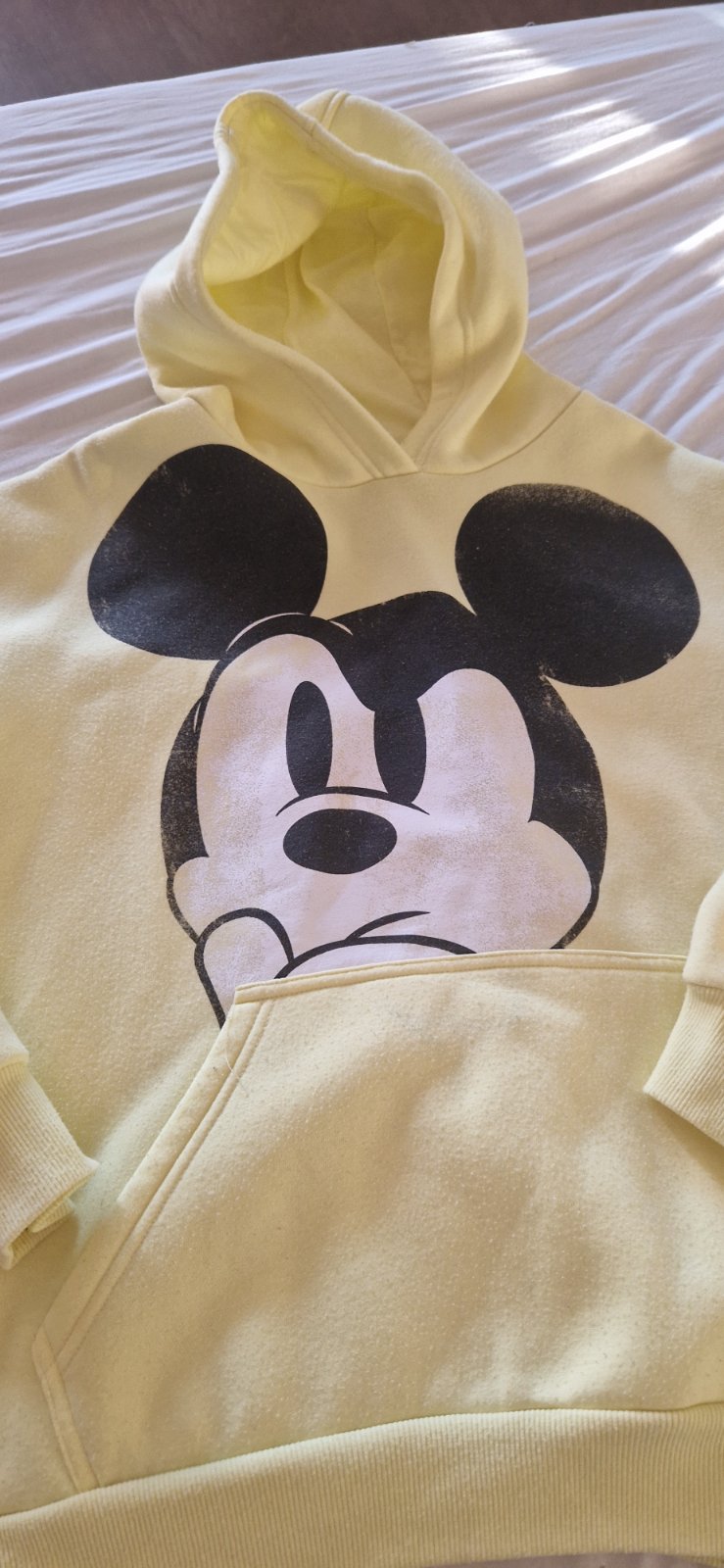 Mikina je nosena, na potlaci vidno pranie, hrubsi material, jemne predlzena, pod pazuchou zatiahnuta ale netrha sa a pri noseni nevidno(vid posledna foto)