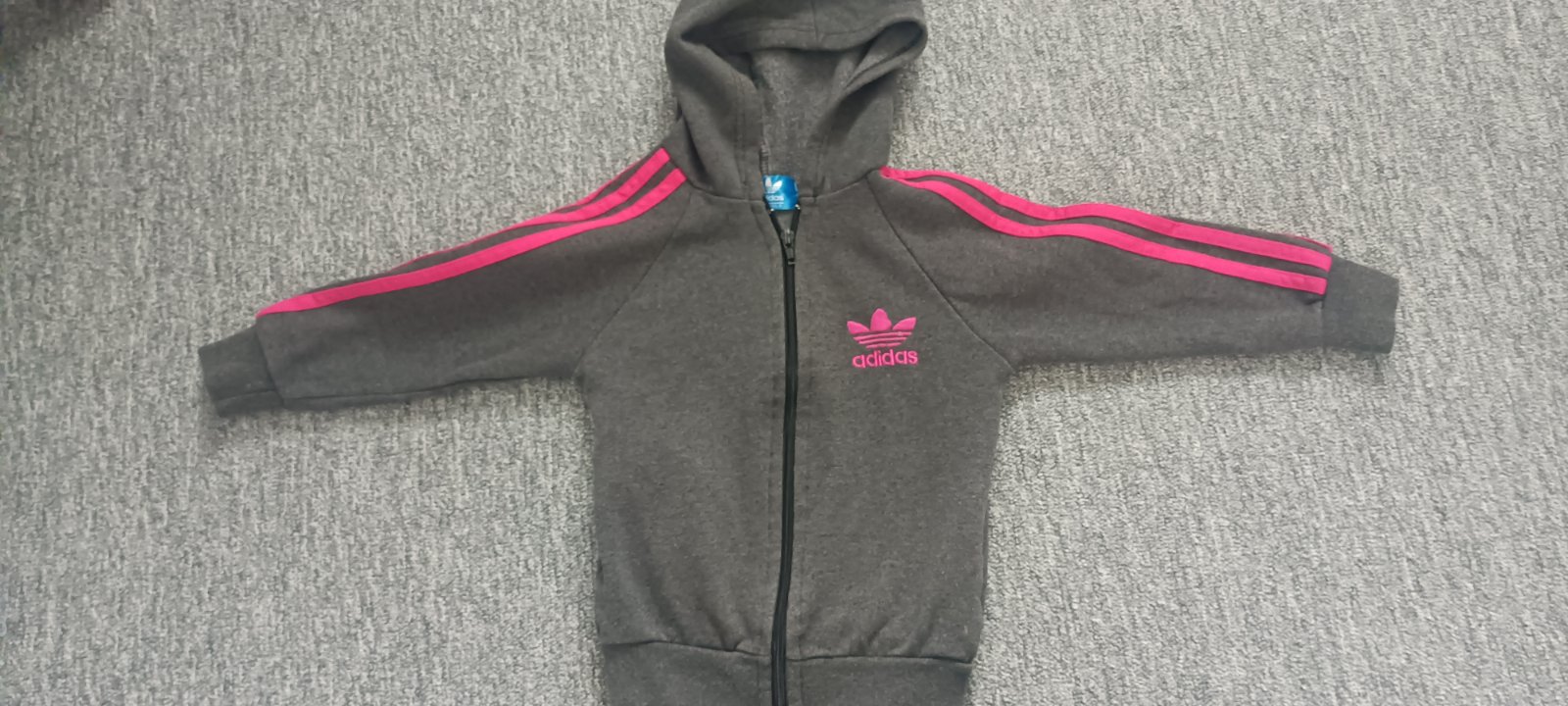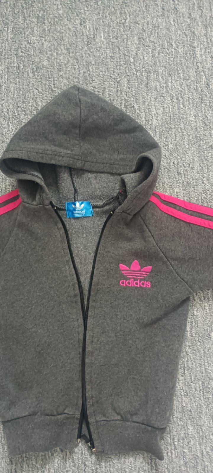 Dievčenská mikinka zn. Adidas, veľ. 104. Nosená. Na kapucni zašitá dierka (od vešania na vešiačik :-)). Dĺžka: 41 cm Šírka: 33 cm Dĺžka rukáva od krku: 40 cm Cena: 2 € + pošta