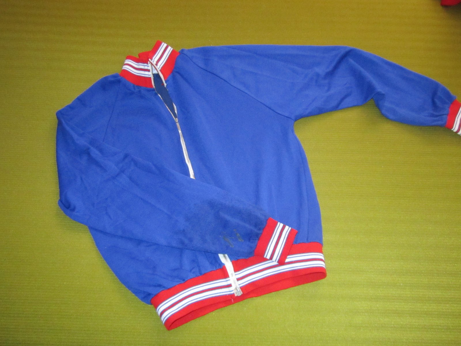 Modrý vrch s červeným kombin., raglánové ruk. so zipsom vpredu. Na pravom ruk. je fľak, pravdepodobne od lepidla. Málo nosený, zachovalý.