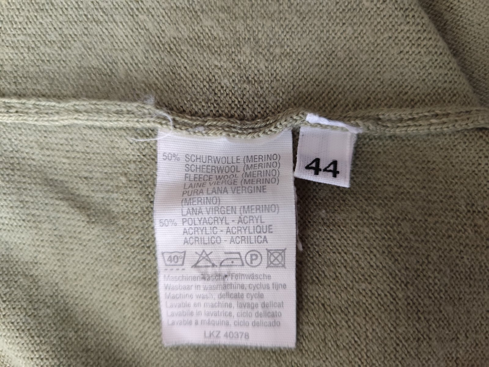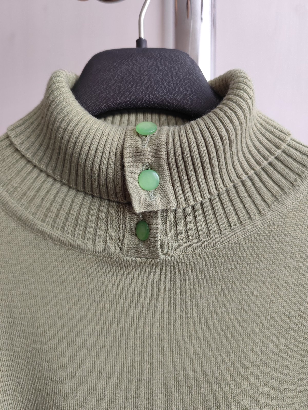 Pekný dámsky pulóver ku krku, ktorý môžete nosiť aj ako rolák. Farba je svetlo-olivová, označený č. 44. Je to však elastický úplet a v kľude má cez prsia 2 x 56 cm (povolí o 2 x 10 cm). Dĺžka 70 cm, po stranách rázporky. Výborný stav.
