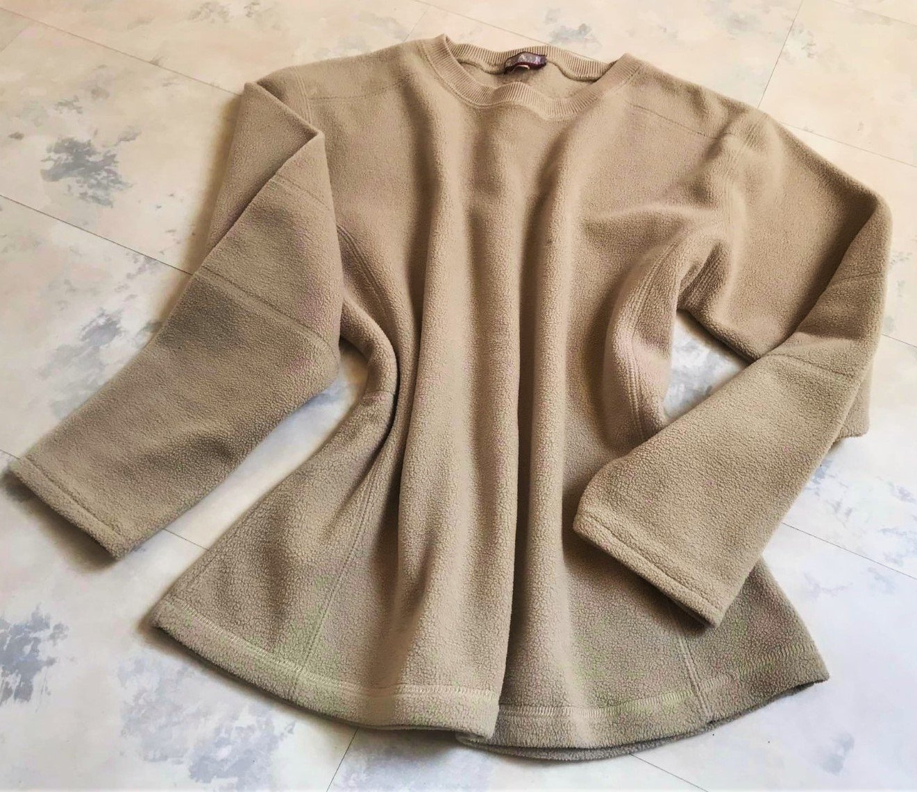 kvalitná teplá neznosená mikina,spadnutý rukáv,strihaná jemne do áčka,pekne popreštepovaná na bokoch a na rukávoch,vpredu malinká akoby chybička,jemne na malom mieste vypadnutý flis,ale bežne to nie je vidno voľným okom,ale upozorňujem,dlžka = 64 cm, šírka = 55 x 2 cm, rukáv od rumby na krku = 70 cm - 13 cm ramená,57 samotný spadnutý rukáv