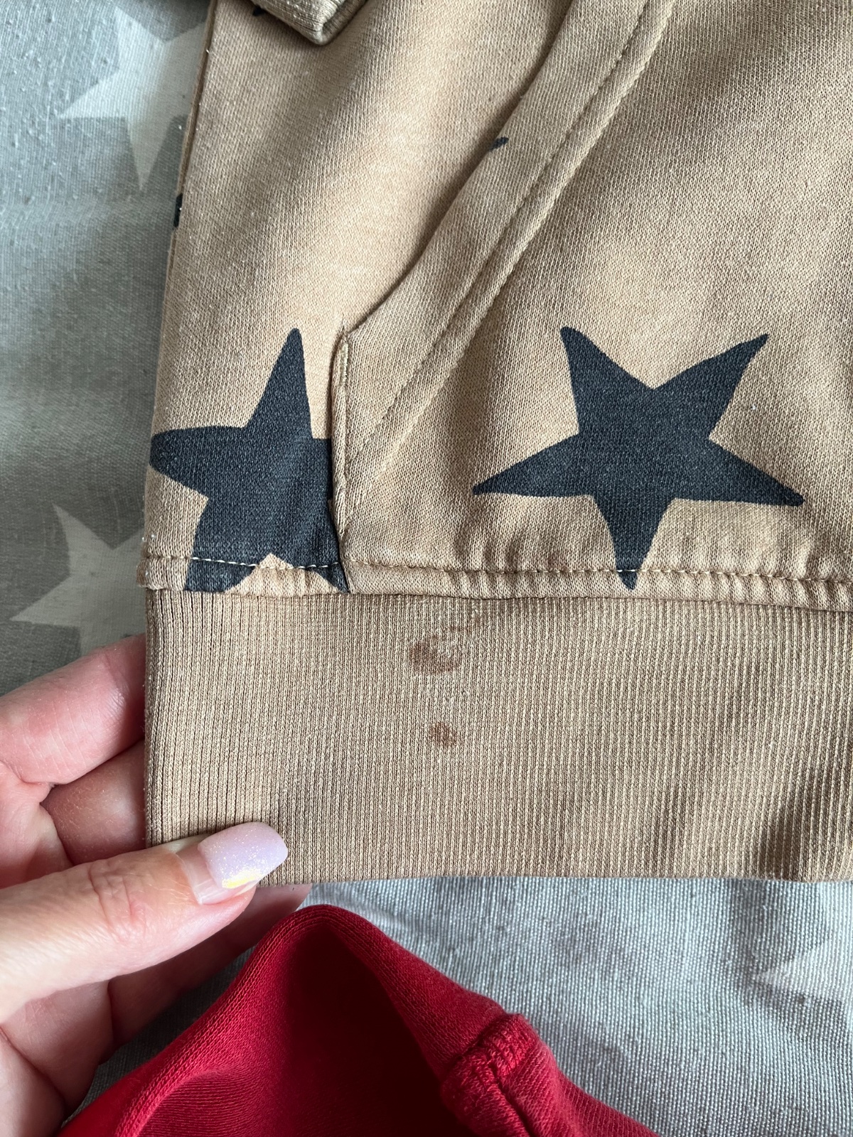 Mikinka je velkost 6/7 rokov ale u nas nosena vo veku 5-7 rokov. Bez akýchkolvek poskodení, stale pekné farby, u nas velmi oblubena .