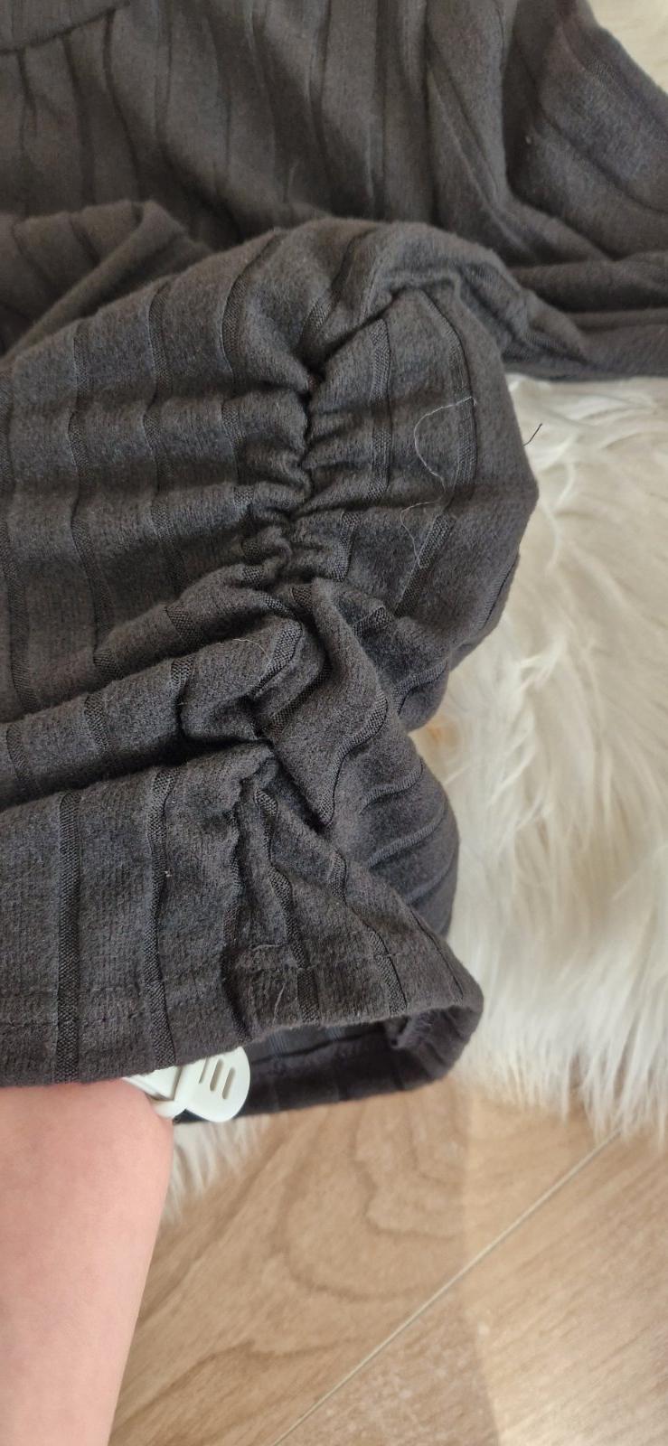 Materiál je veľmi príjemný na dotyk, taky jemný. Po bokoch na páse sú vyšité gumičky, tak pekne drží. Celková dĺžka v kľude 48cm, dĺžka rukávov 59cm.