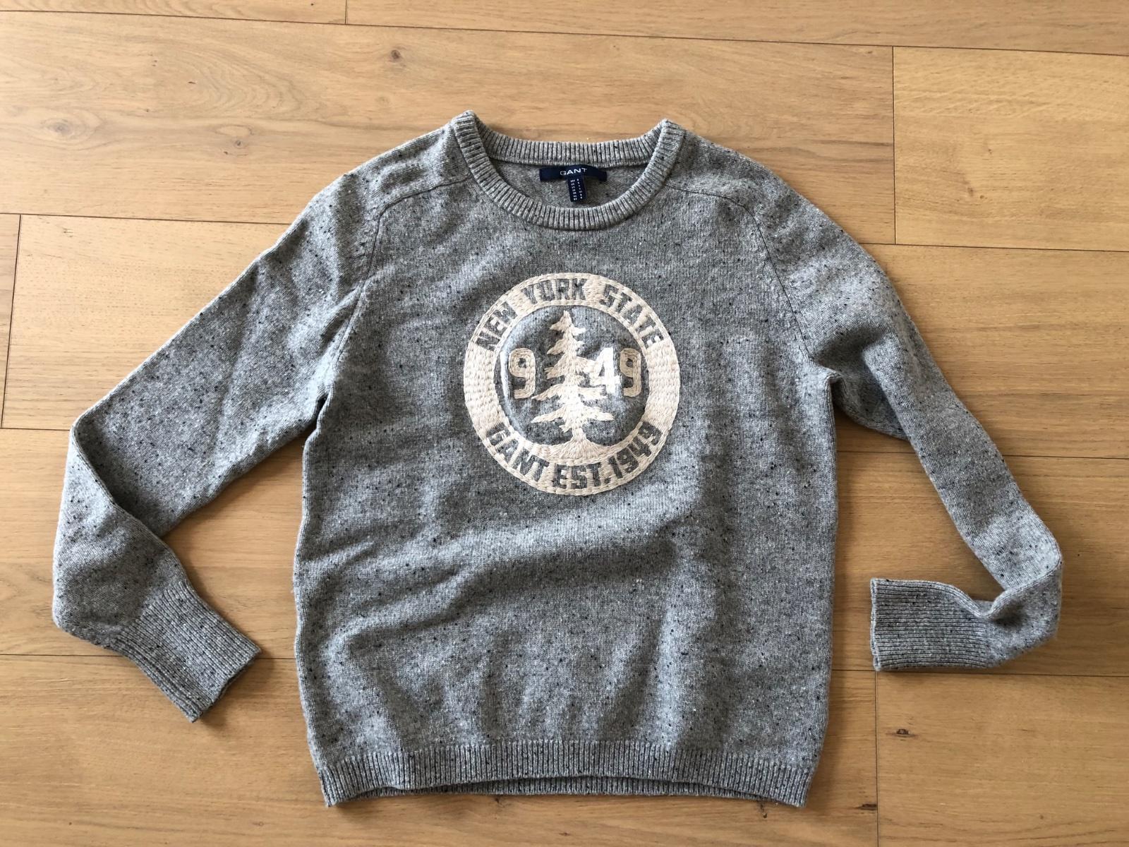 Krásny vlnený sveter Gant- veľkosť píše S, ale je to skôr M, rozmery: šírka: 51cm, celková dĺžka: 59 cm.