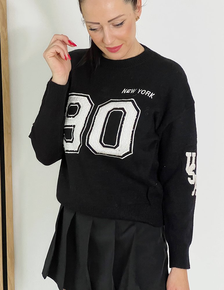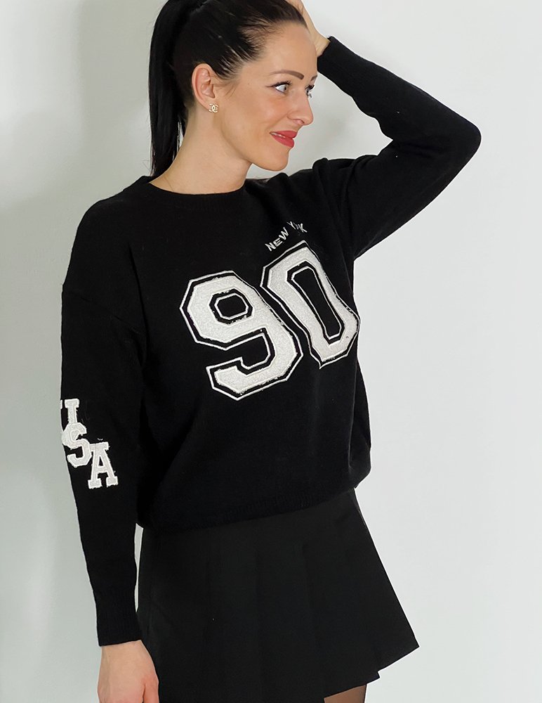 Čierny sveter 90s je trendový pohodlný sveter s okrúhlym golierom. Sveter sa dá kombinovať k elegantným a štýlovým outfitom ale aj k ležérnym leginovým lookom.