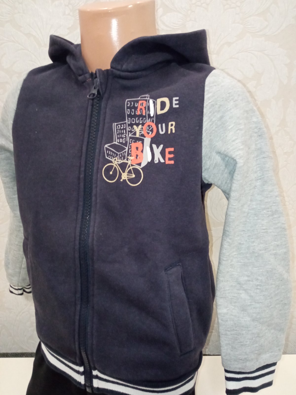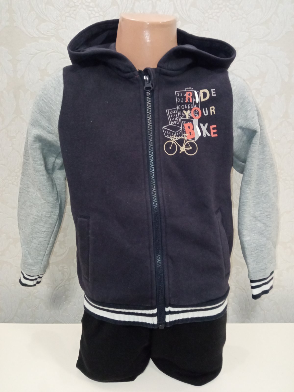 Chlapčenská mikina s kapucňou, zapínanie na zips,dve bočné vrecká, jemne elastická, vo vnútri jemne zateplená flísom, materiál 72%bavlna,28%polyester, farba tmavomodro-sivá.