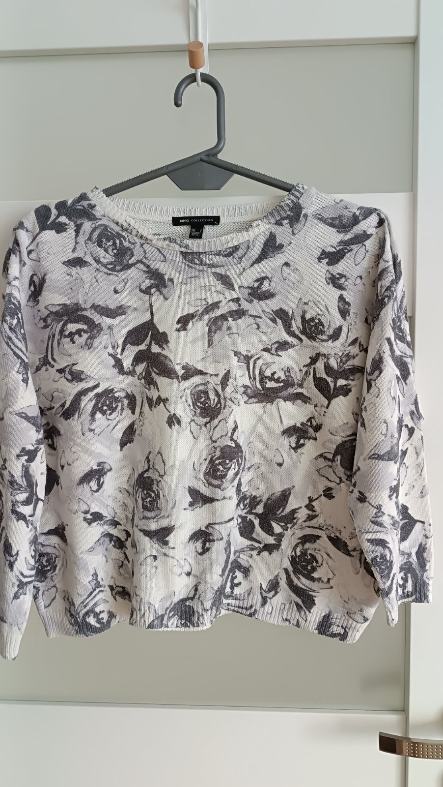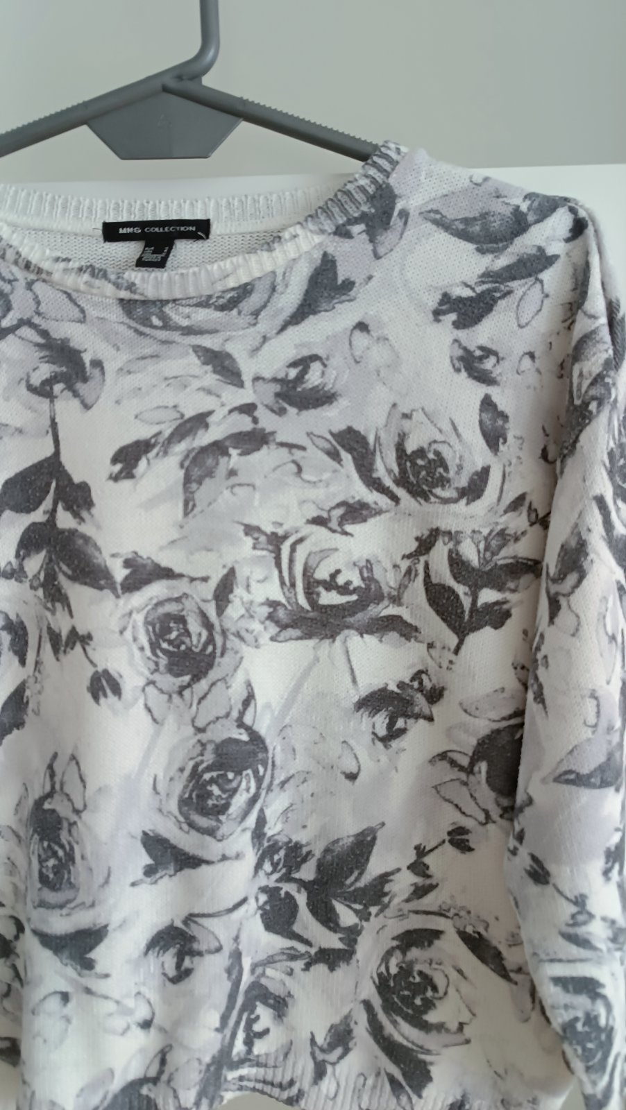 Bielo sivá krátka mikina, uvedená veľkosť M, ale myslím že skôr veľkosť S. Dĺžka 52cm, dĺžka rukáva od krku 52 cm, Dĺžka 50 cm, 67% polyester, 33% bavlna, noseny iba mnou, žiadny second hand, kúpený v Mango