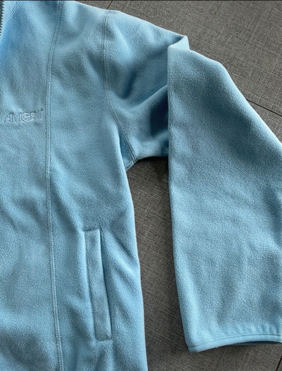 krasnej bledomodrej farby, jemný kvalitný flis, vpredu dve vrecká, vyšitý drobný reklamný nápis v rovnakej farbe