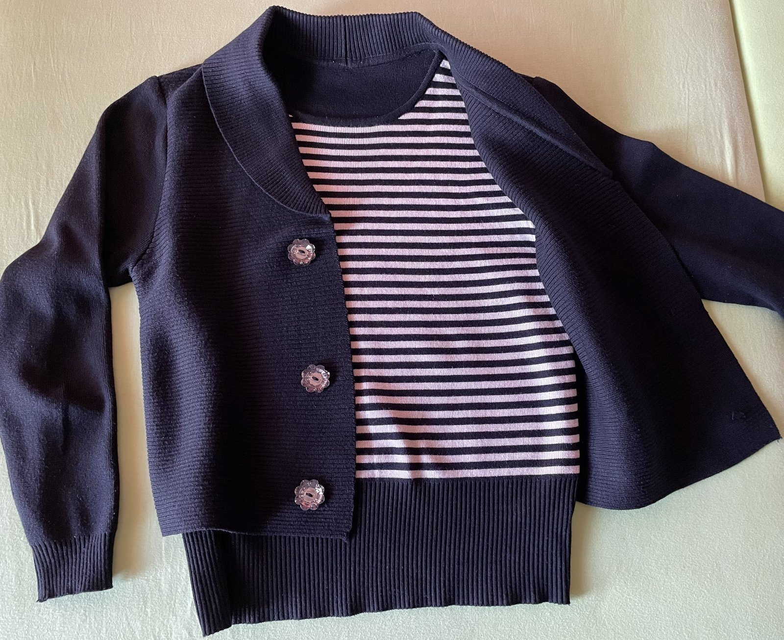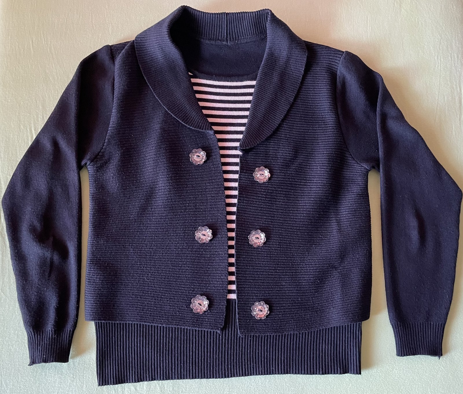 Tmavomodrej farby. Oblieka sa cez hlavu. Veľkosť 42. Rozmery: dĺžka 57 cm, šírka v podpazuší 2x49 cm.