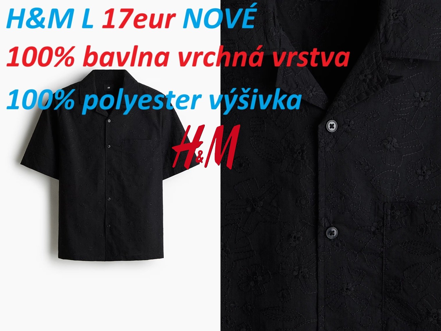 Ďalej predám pánsku košeľu H&M, veľkosť L. Košeľa je vyrobená zo vzdušnej bavlnenej tkaniny s celoplošným vyšívaným vzorom. Otvorený golier, hladké zapínanie, sedlo na chrbte, krátke rukávy, náprsné vrecko a rovný spodný lem s rozparkami po bokoch. Košeľa je 100% bavlna vrchná vrstva, 100% polyester výšivka a klasický strih. Košeľa je nová. Cena 17eur.