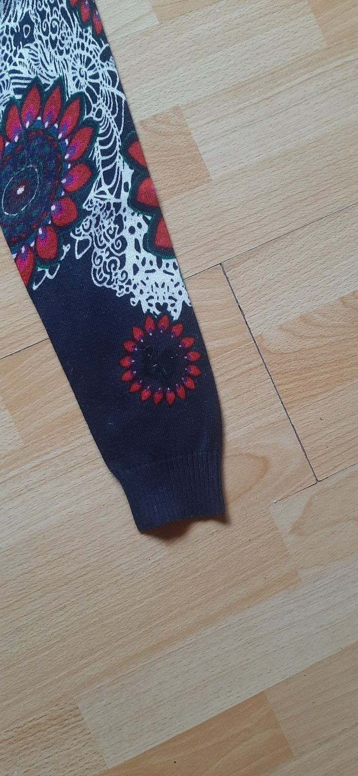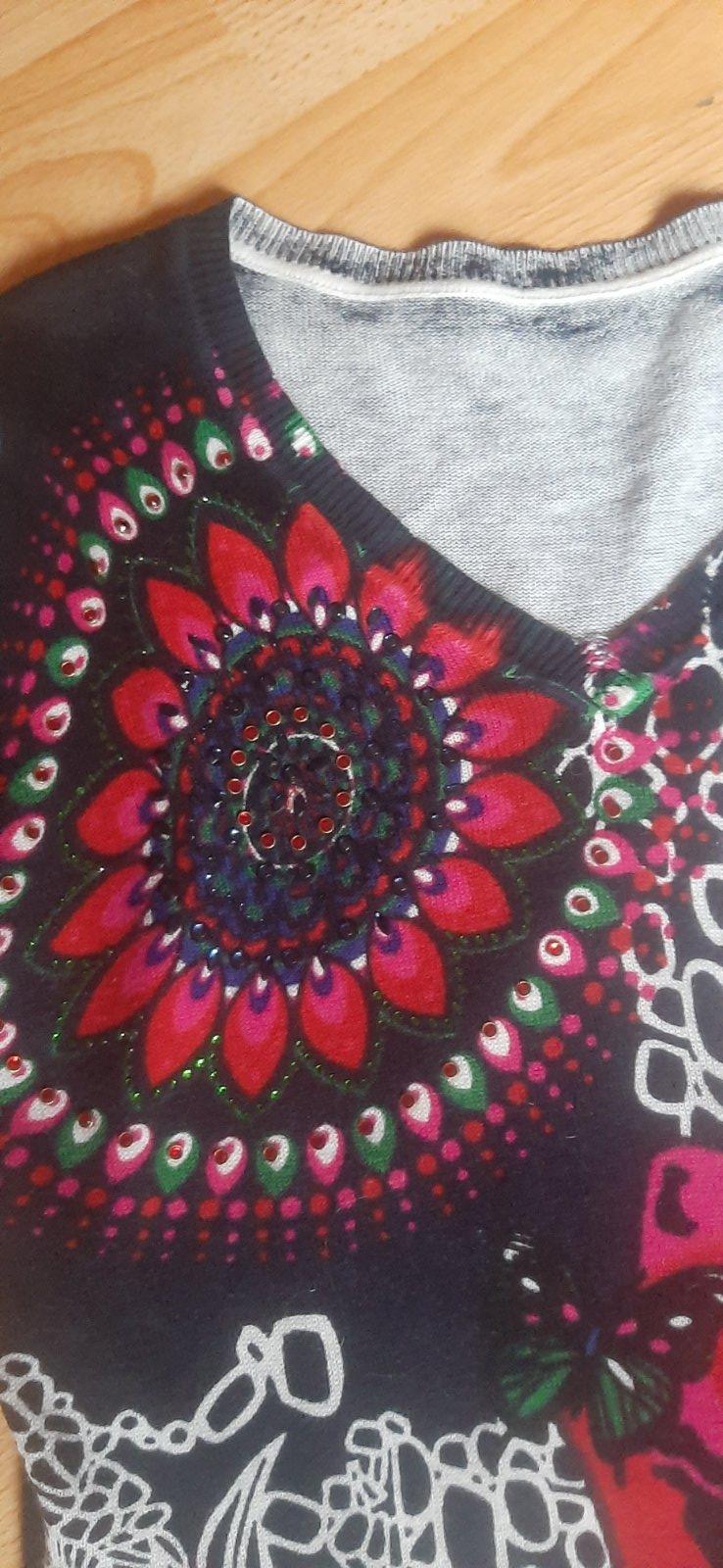 Pulóver s farbami ako značka Desiqual, aj tak na bazáriku kupovaný, ale nemá značku. Má krásne zdobenie, užšie rukávy, nie je veľmi tenký. Škoda, mne je úzky. Pomerajte sa: