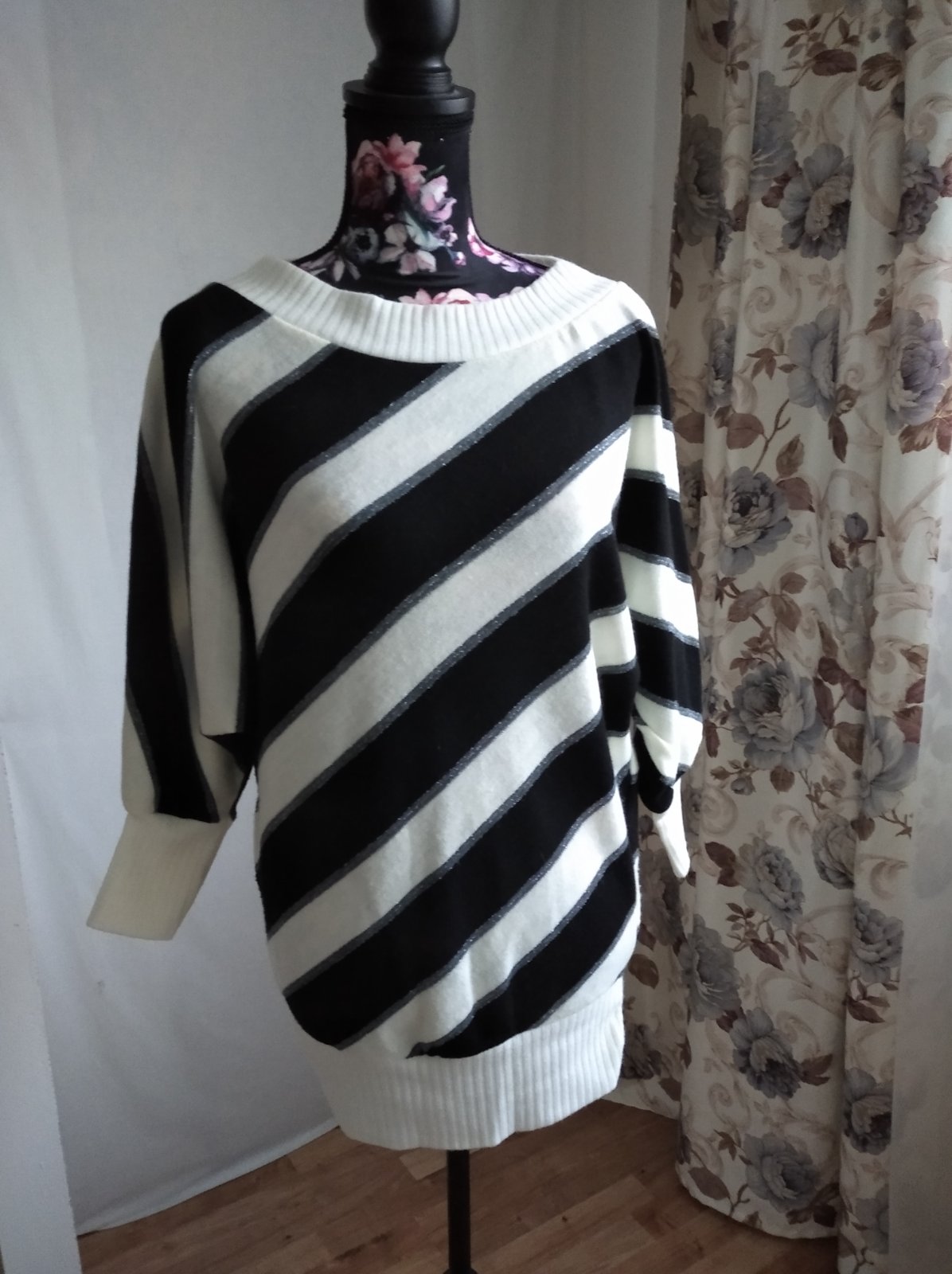 Noseny, nepoškodený, farba je smotanová -cierna-strieborna. Rukávy sú trojštvrťové, netopiery strih.