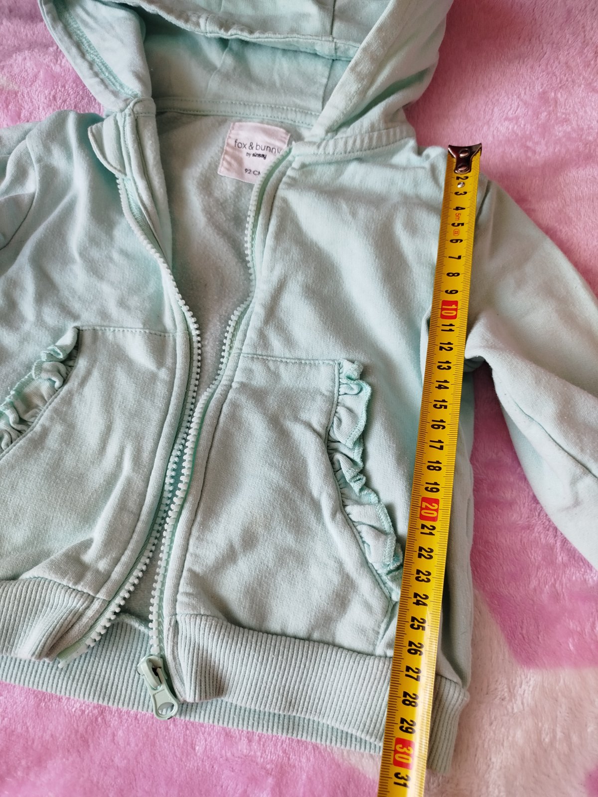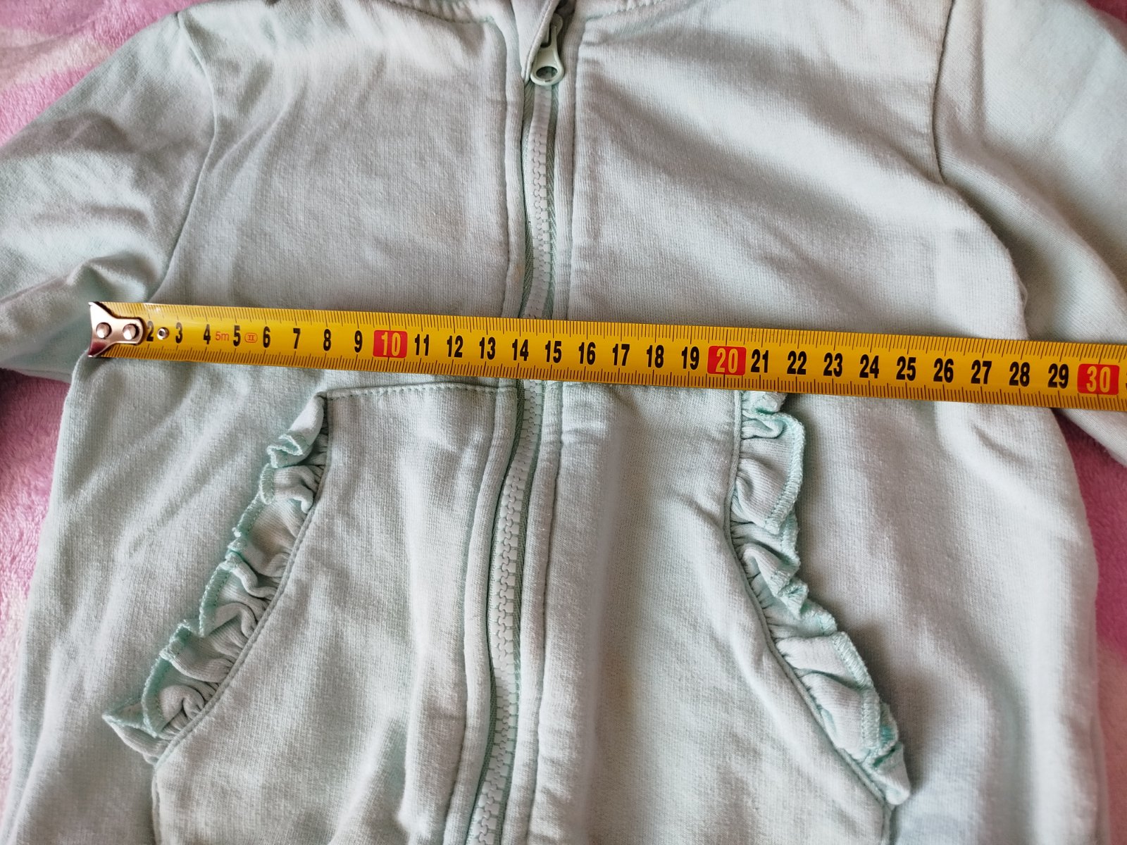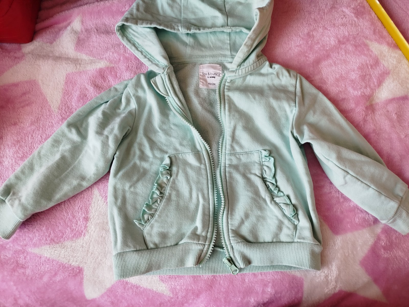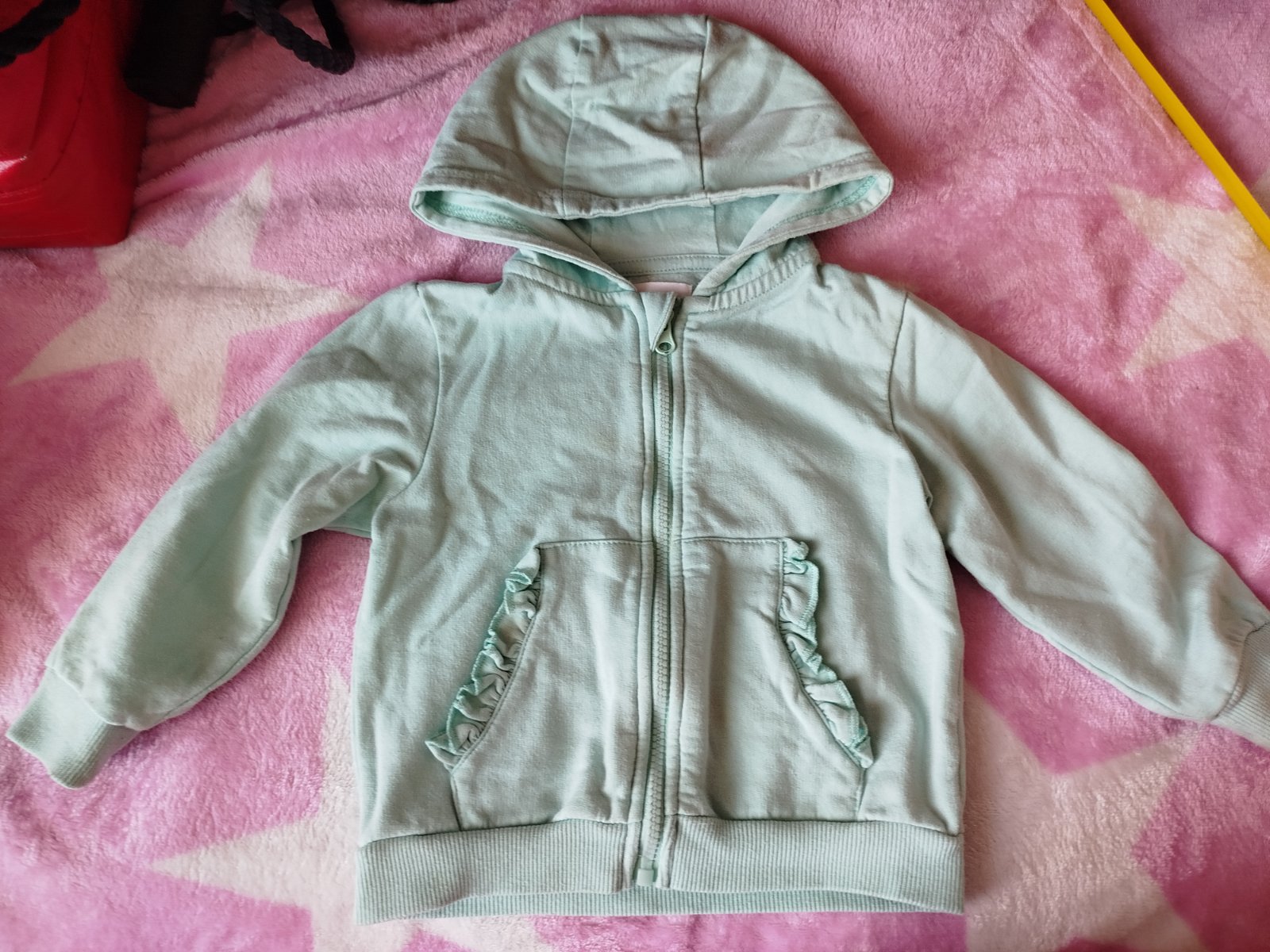 Naživo krásna jemná zelená, na foto farba vyzerá vypraná, ale nie je, nazivo je to krásna jemná mätová. Jemnucko zateplený materiál, je to skôr letná mikina. Bez fľakov či poškodení, stále pekná. S vreckami s volánikmi aj s kapucňou.