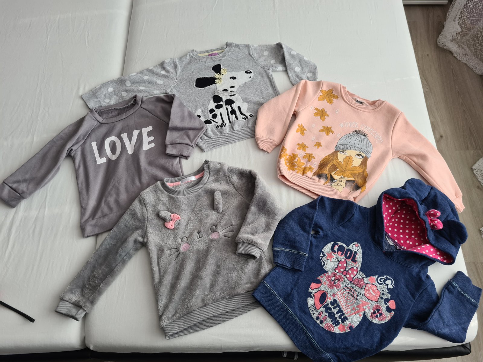 Svetrik-psícek F&F. Sivý zajko Pepco. Siva LOVE alliexpres. Lososova a minnie (neviem).