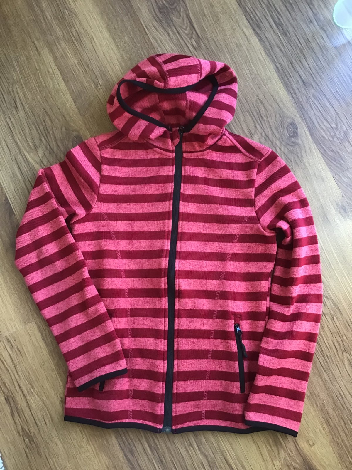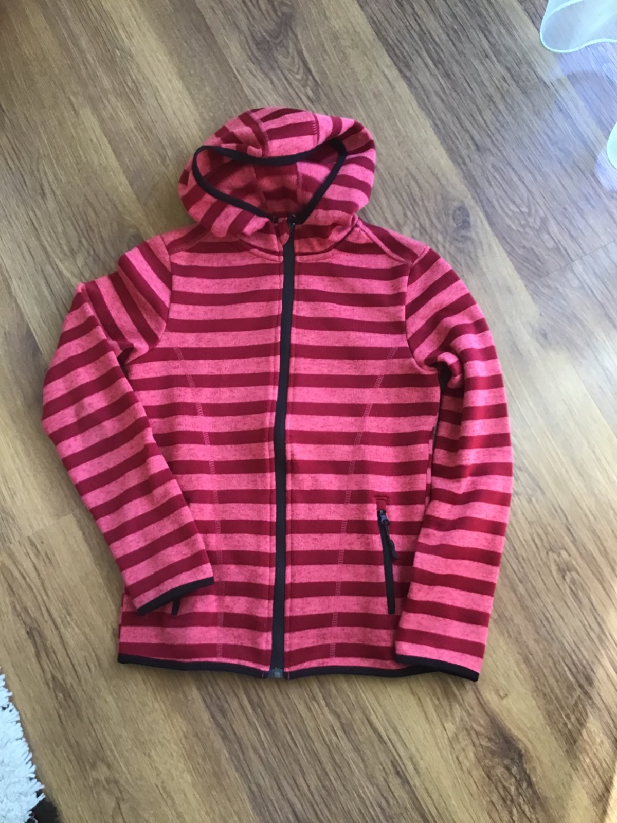 Mikina, vel. 146/152, mikinka je zvrsok ako pleteny sveter, zvnutra je flisova. Je bez poskodeni, pekny noseny stav. Farba je pekna cervena, s ruzovo-cervenym pruzkom.