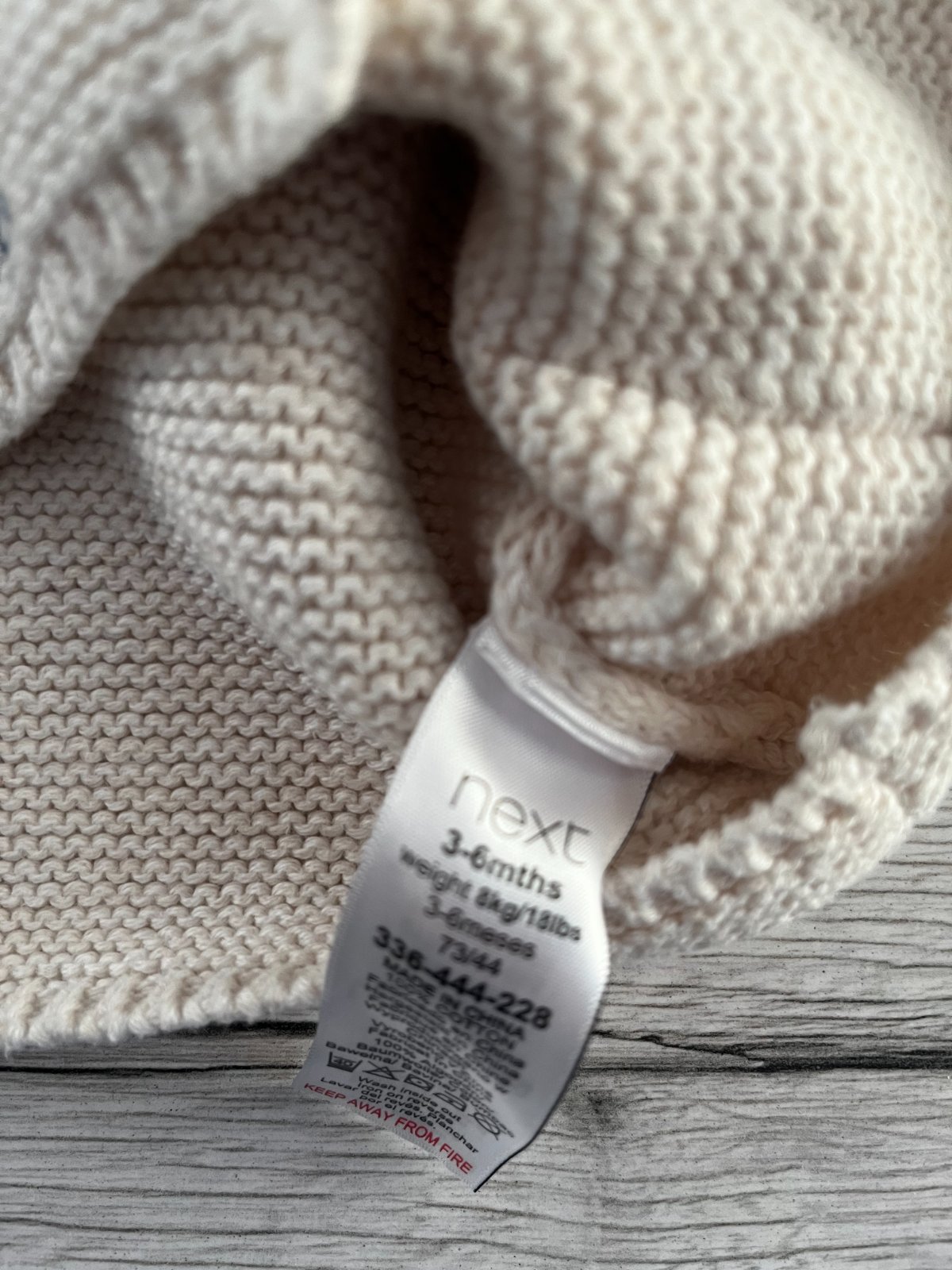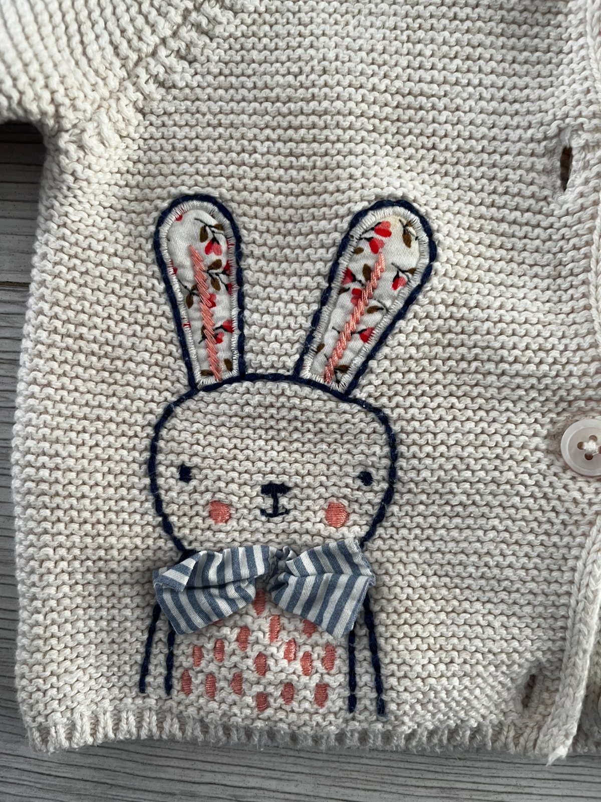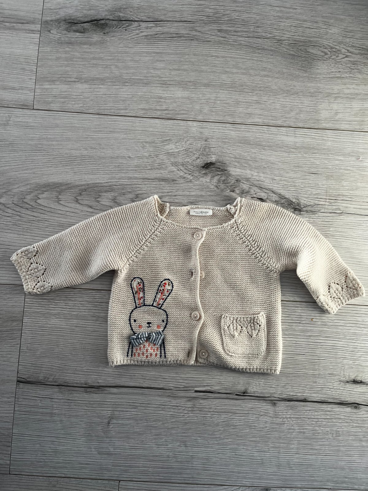 Predám vo výbornom stave krémový svetrík s obrázkom zajačika so zapínaním na gombíky značky Next, veľkosť: 68 (3 - 6 mesiacov).