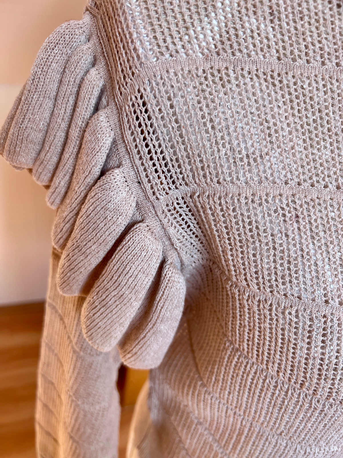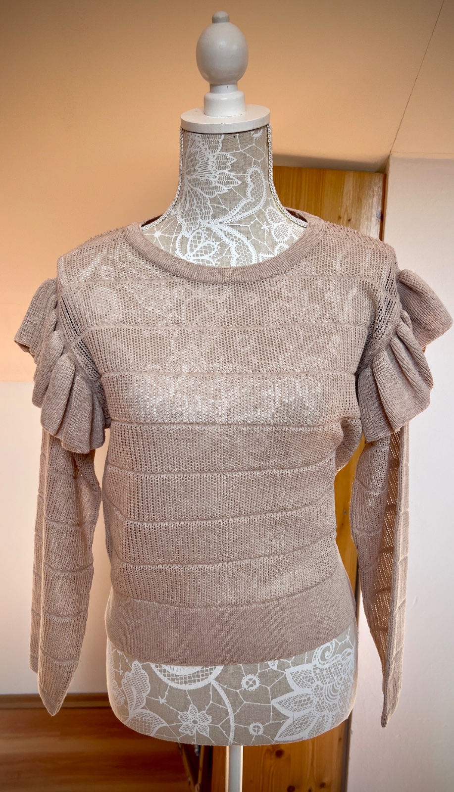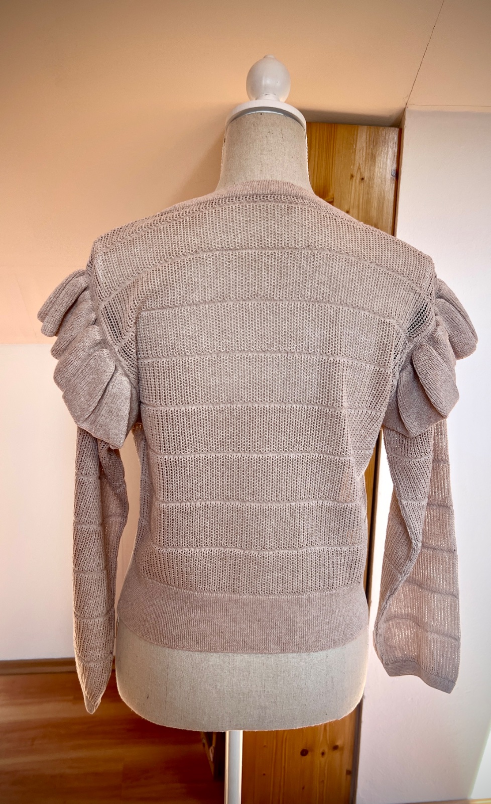 Bledoružový pulóver s volánmi na rukávoch. Tenký a skôr štýlový ako hrejivý. Takmer nenosený. Značka Mango. Veľkosť S.
