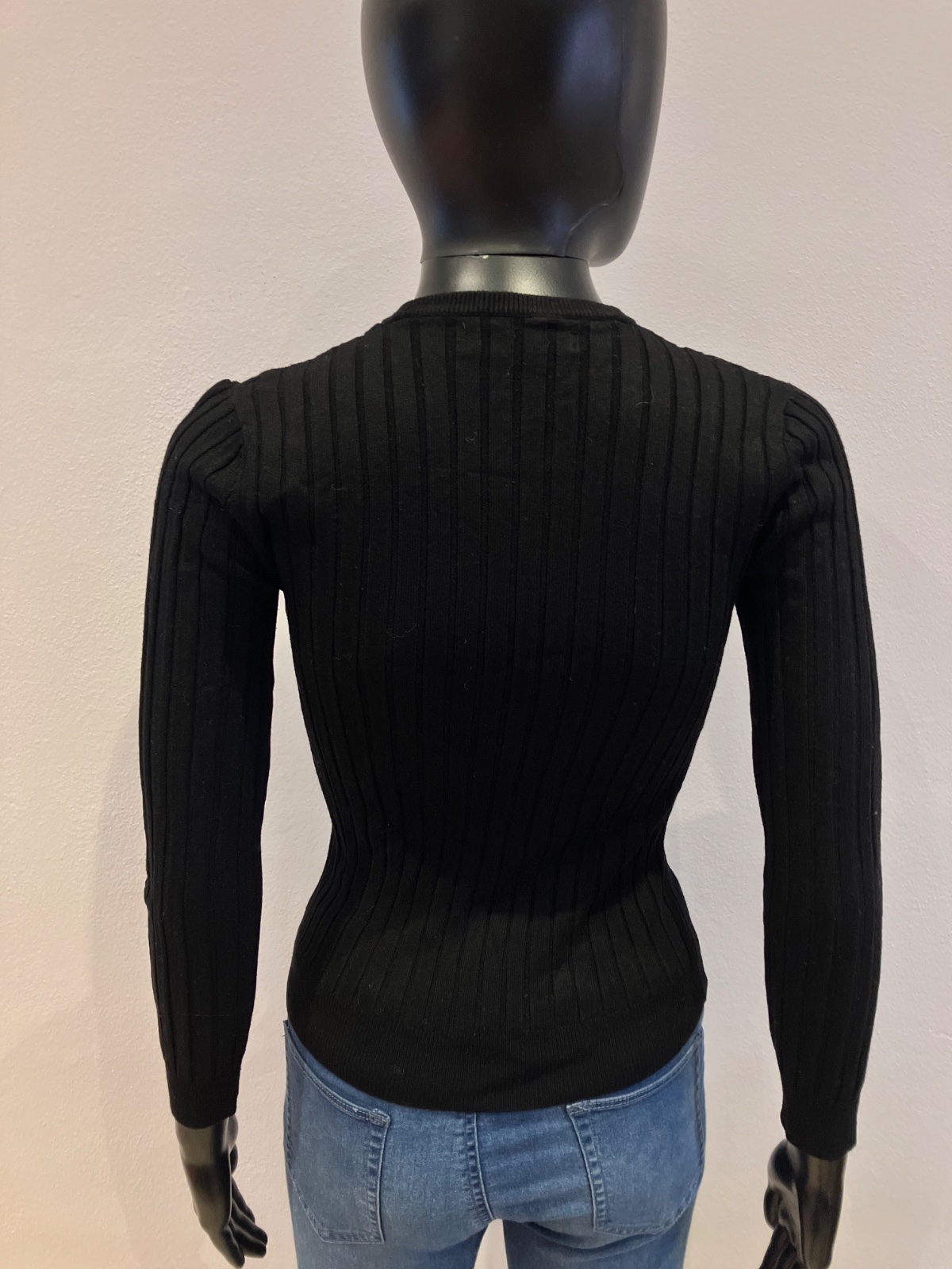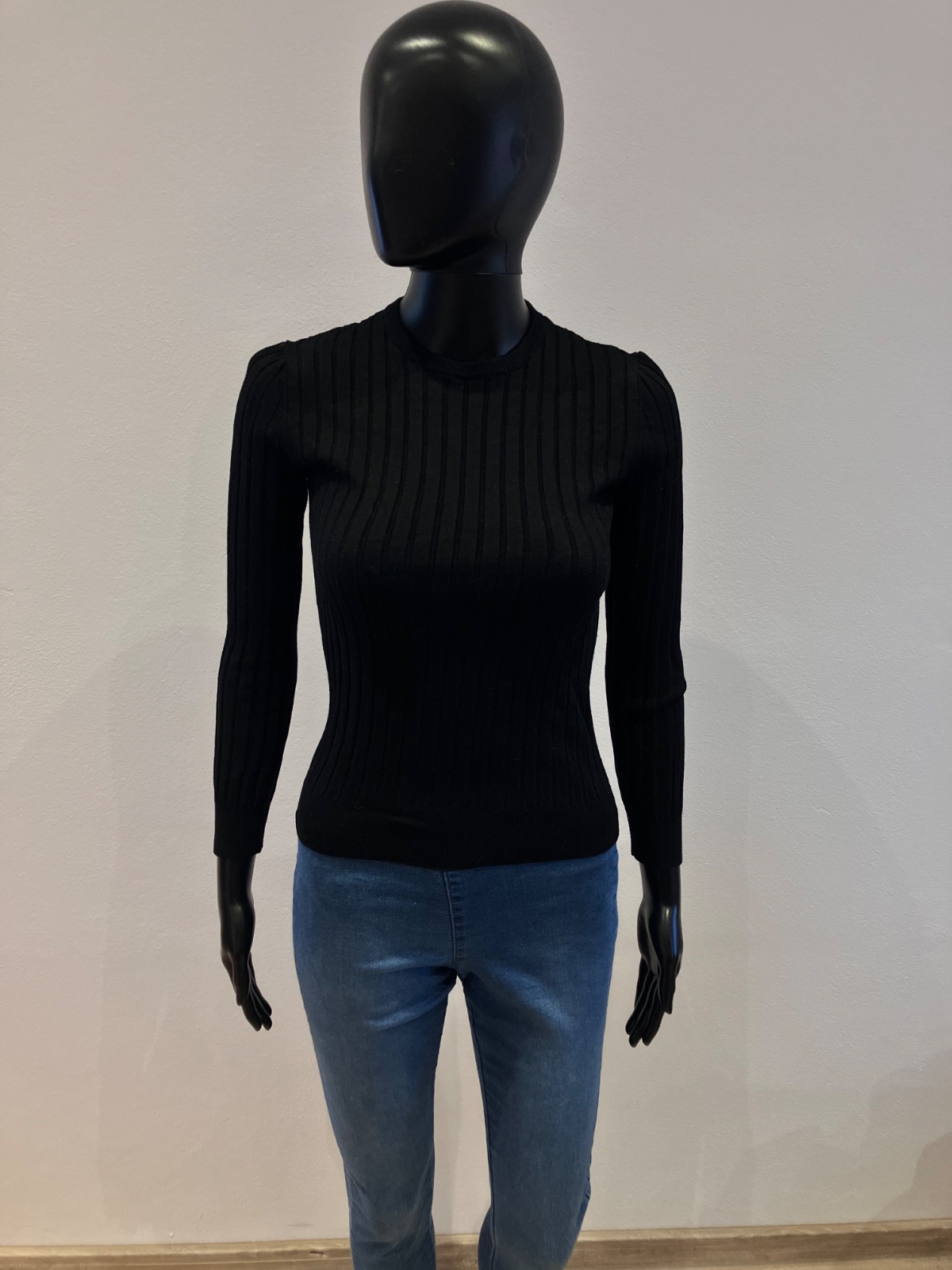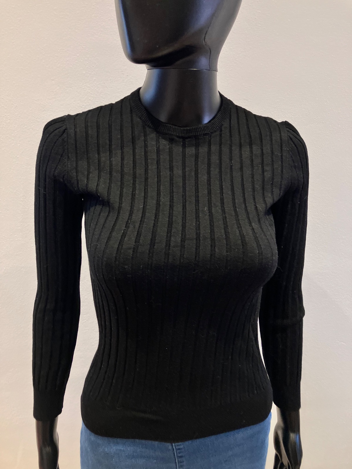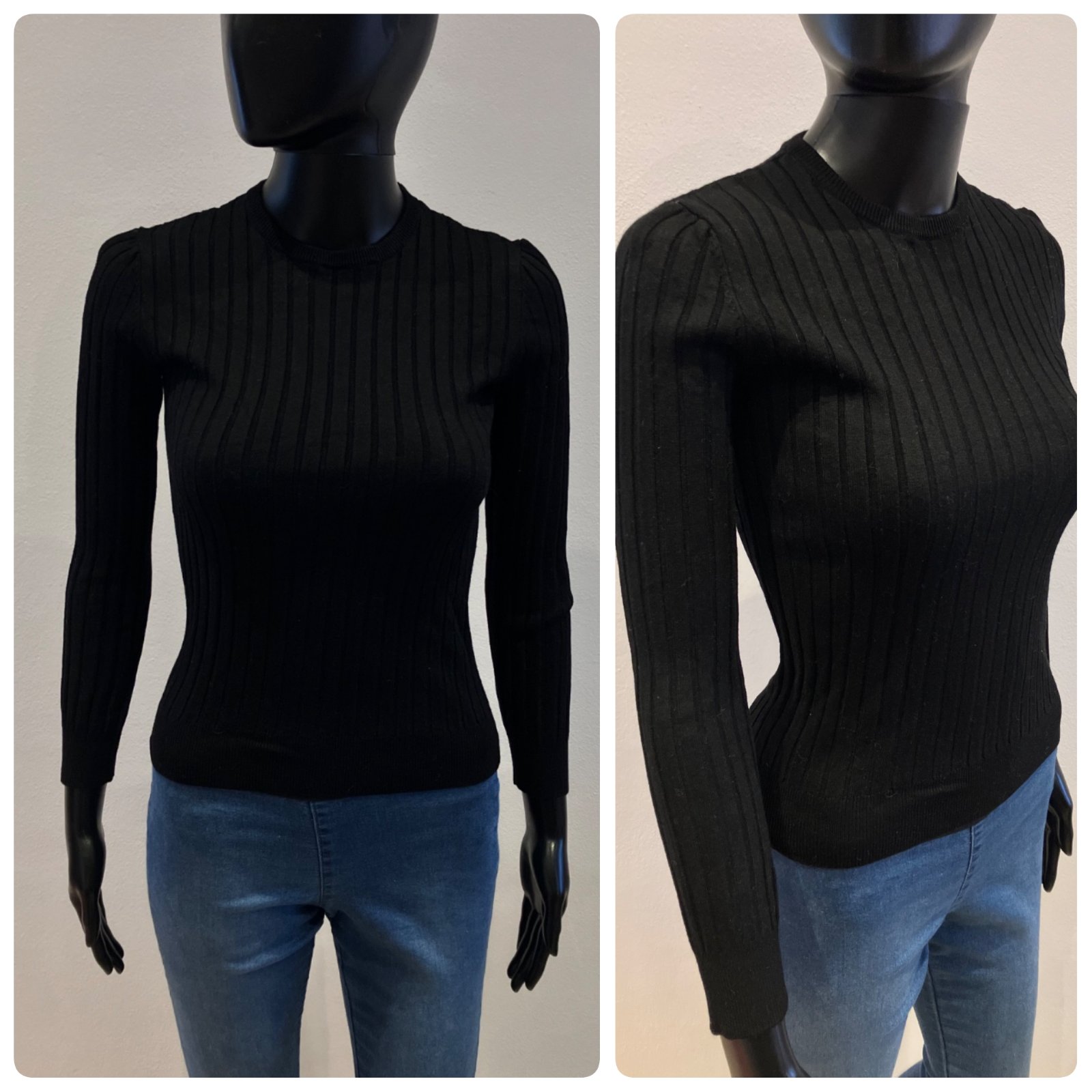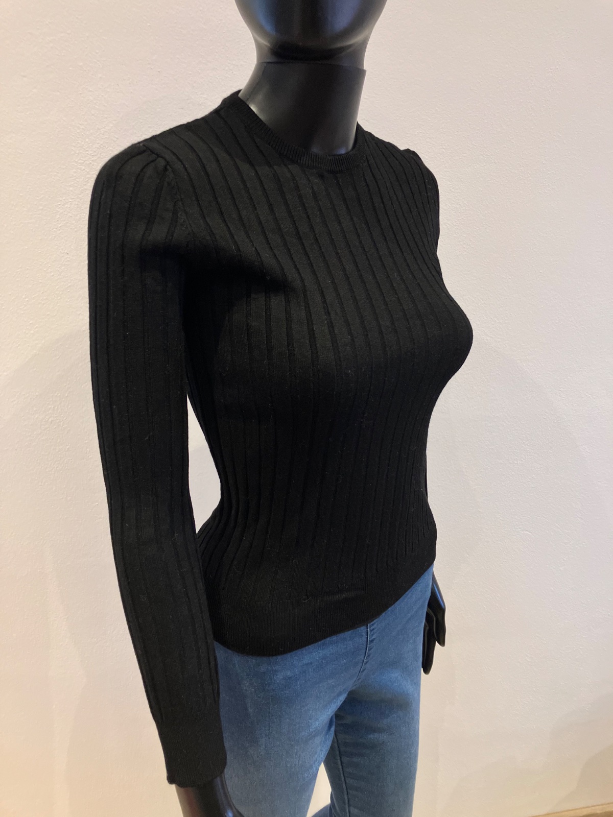 Dámsky sveter, rebrovaný, tenší, elastický, okrúhly výstrih.