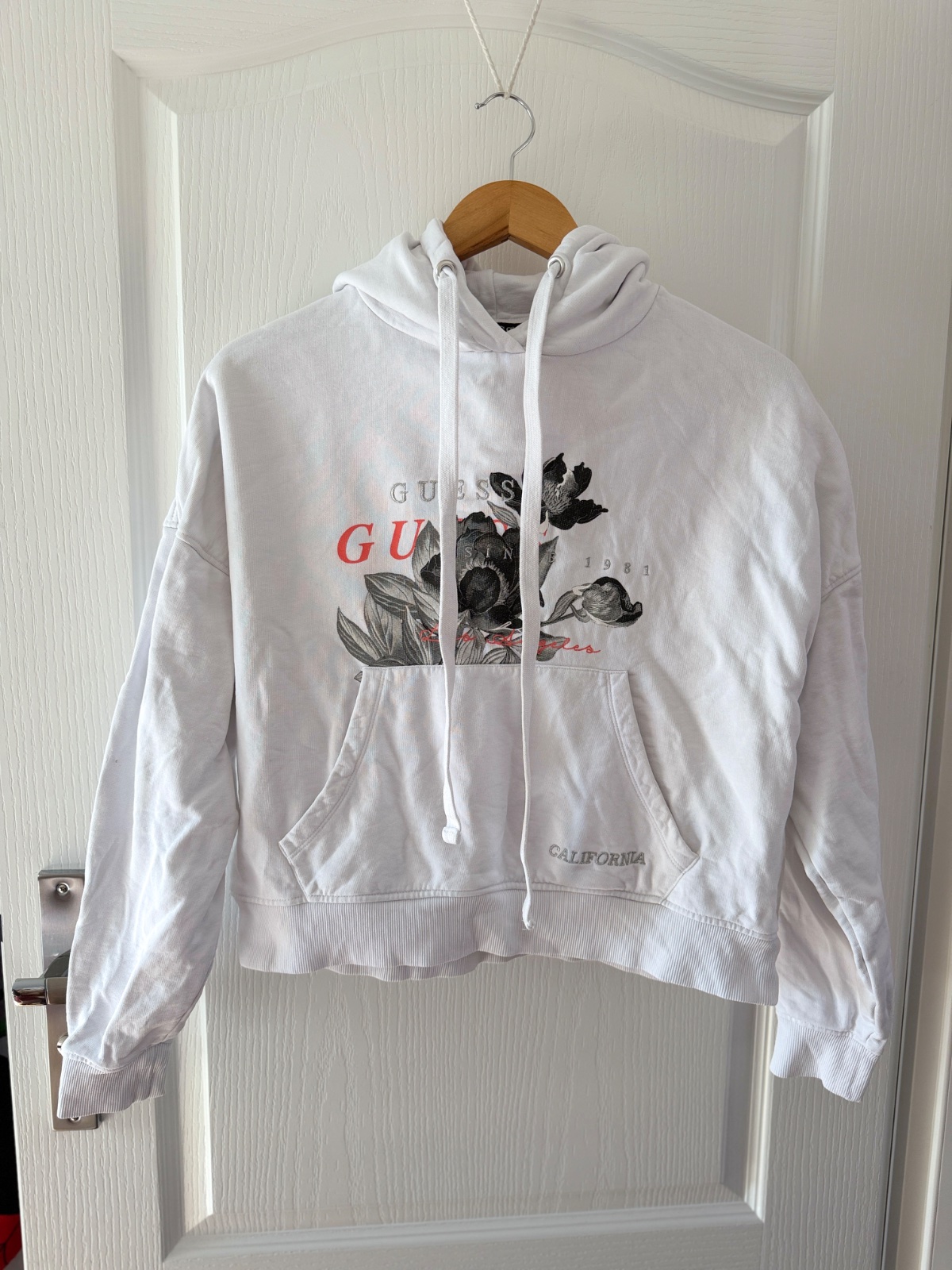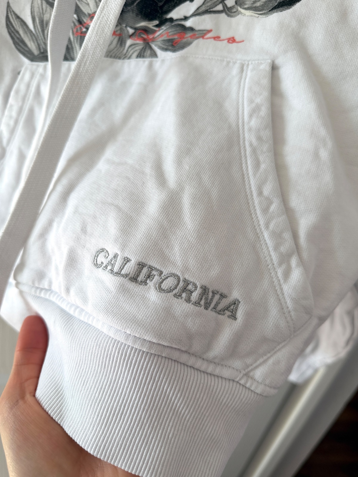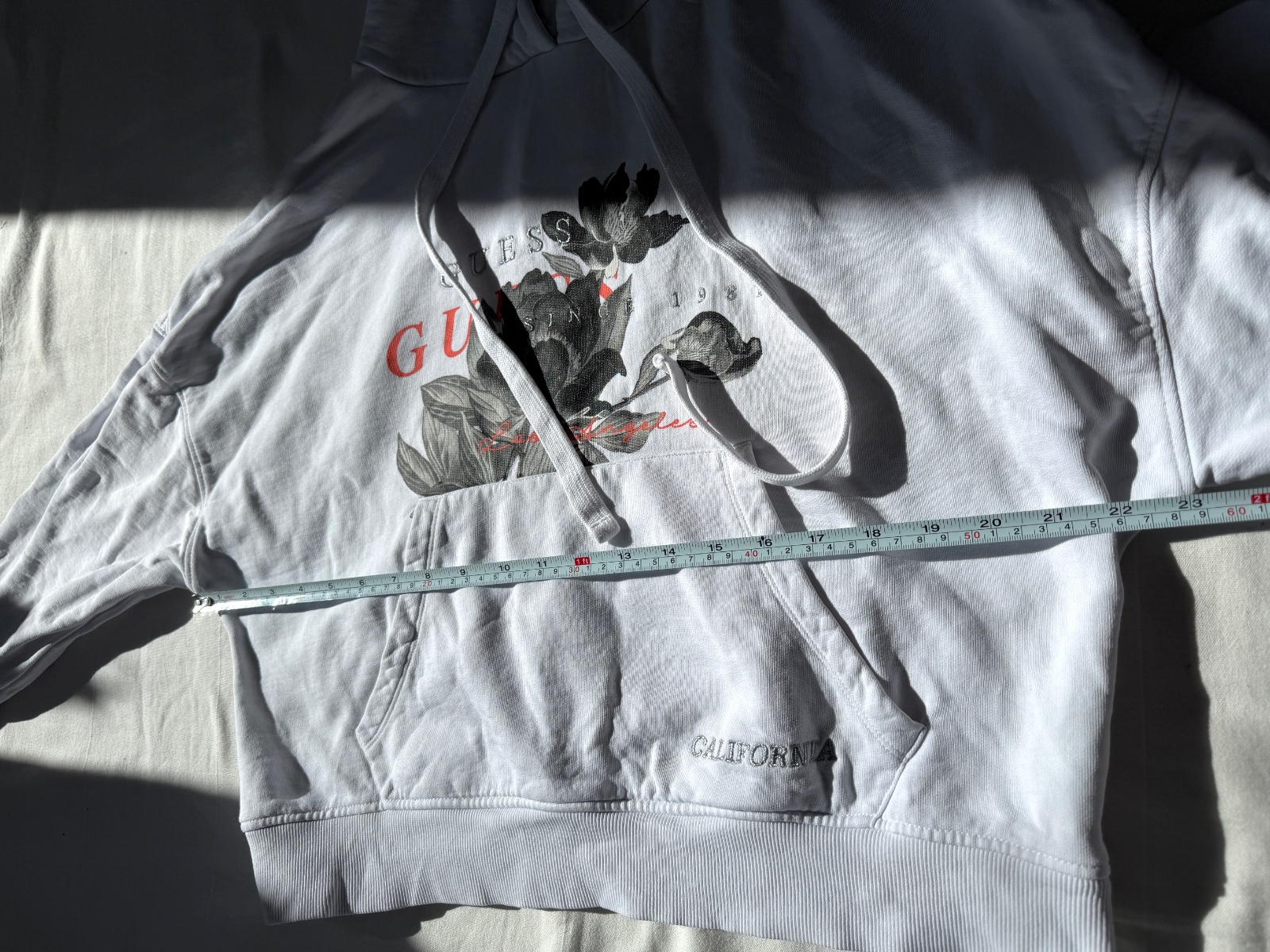 Štýlová a originálna dámska mikina GUESS, ktorá kombinuje klasický športový strih s elegantnými, lesklými detailmi. Ideálna pre tých, ktorí si cenia dizajnérske oblečenie s jedinečným dizajnom. Materiál je 100 % bavlna – mäkká, prírodná a pohodlná na celodenné nosenie. Na prednej strane je veľká umelecká grafika s čiernymi a sivými kvetmi. Slová „GUESS“ a „1981“ sú starostlivo vyšívané trblietavou striebornou niťou. Pod grafikou sa nachádza decentná červená výšivka v štýle ručne písaného nápisu „Los Angeles“. Predné klokanie vrecko zdobí dodatočná strieborná výšivka s nápisom „CALIFORNIA“. Táto klasická mikina umožňuje slobodu pohybu a skvele sedí. Má pohodlnú kapucňu s nastaviteľnou veľkosťou pomocou širokých bielych sťahovacích šnúrok. Spodná časť mikiny a rukávy sú zakončené elastickými manžetami. Zadná strana je úplne hladká a biela. Veľkosť na štítku je S; všetky miery sú na fotografiách.