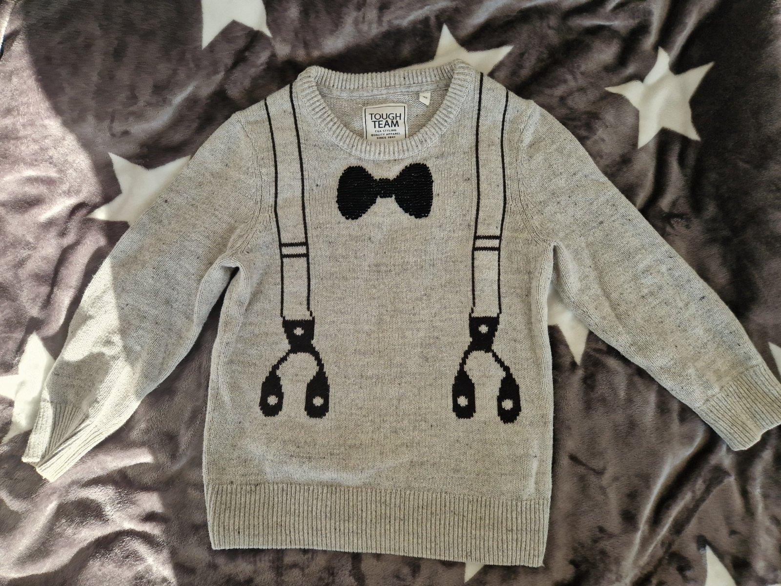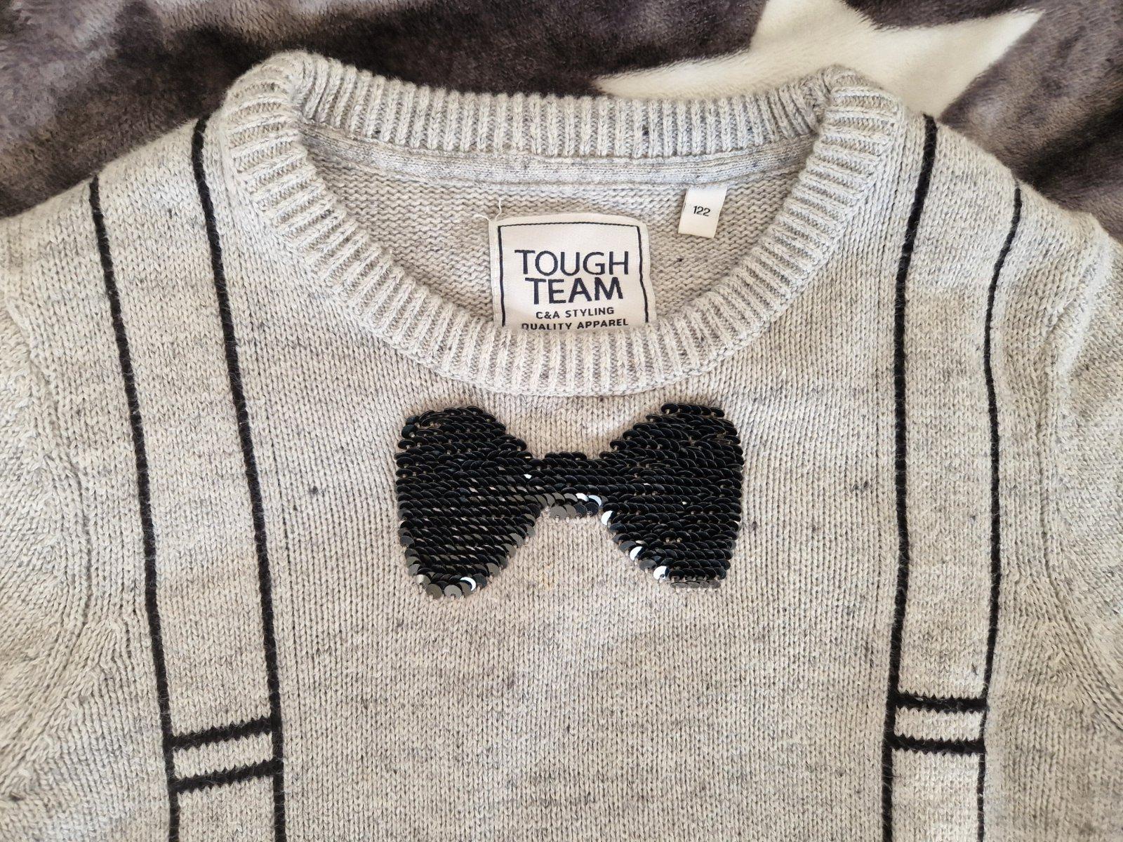 Krásny svetrík, 122 veľkosť, oblečený 2x, zabudli sme na neho, meniaca sa mašľa v predu.