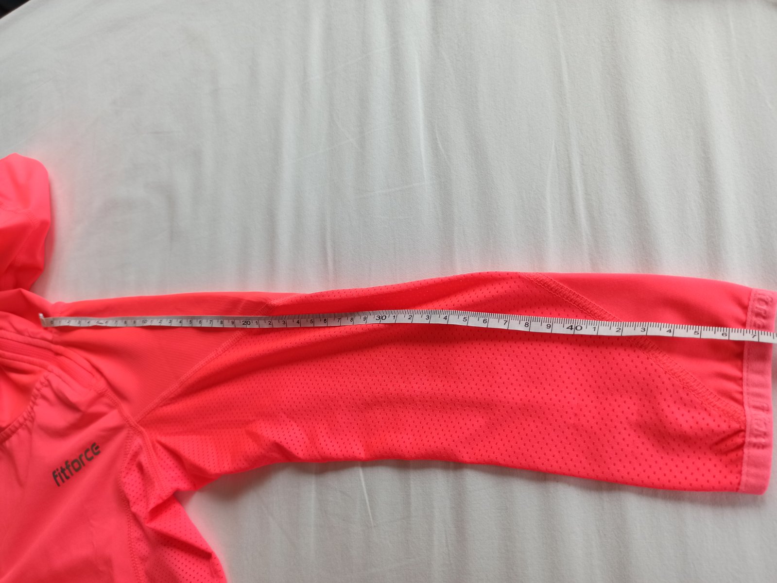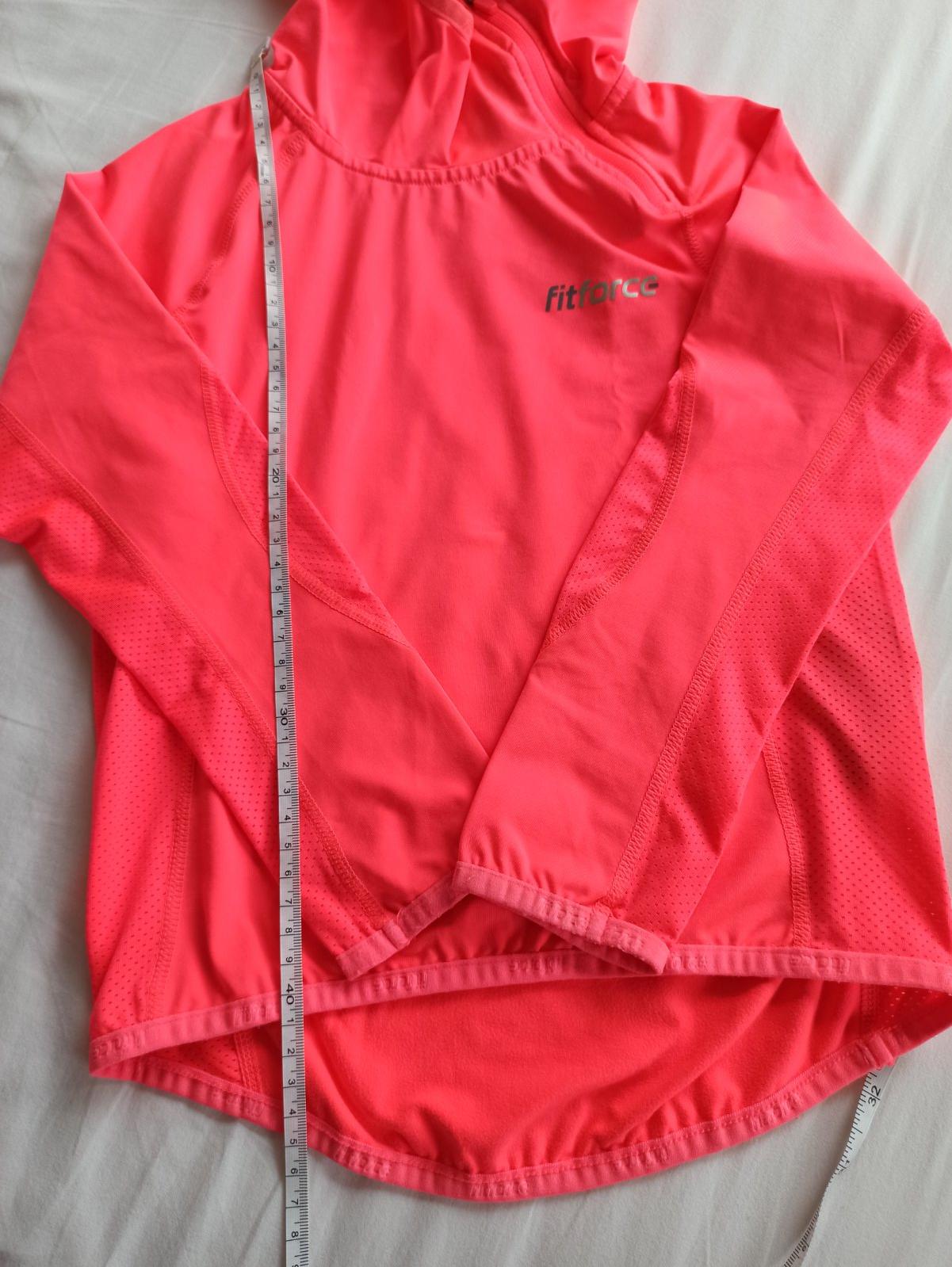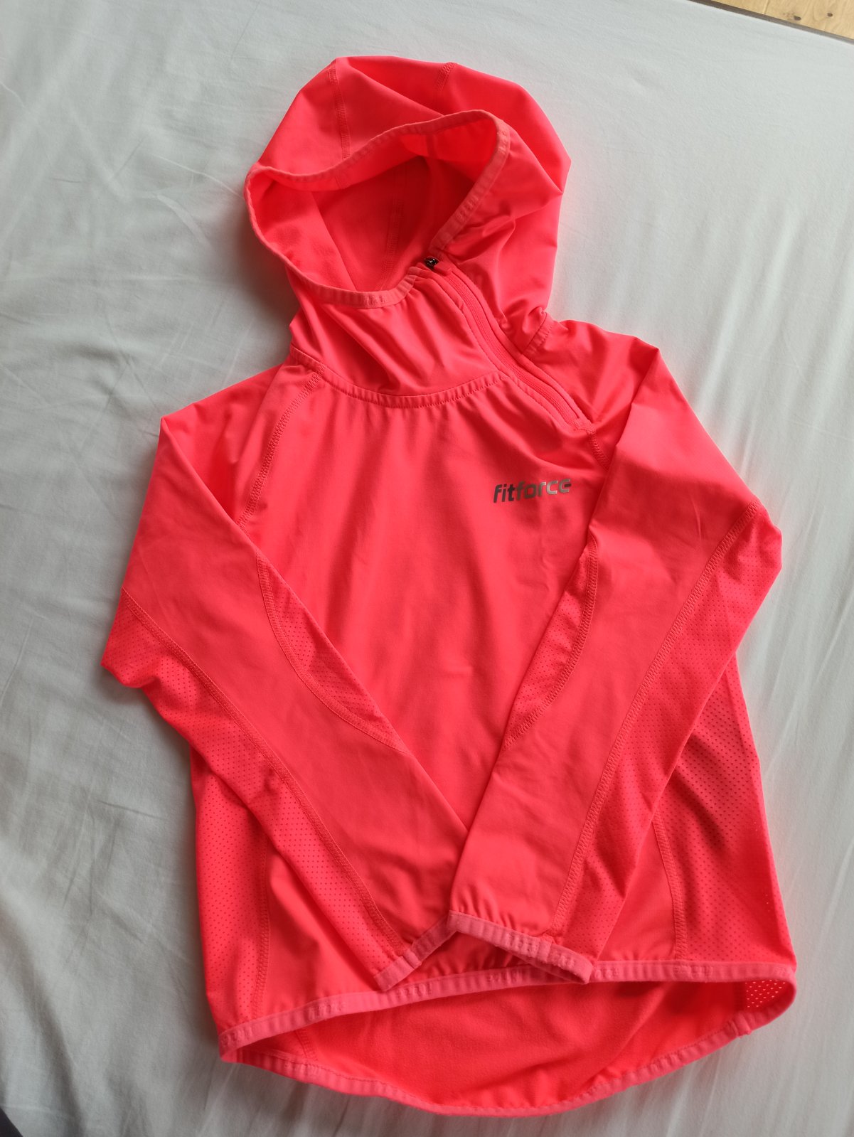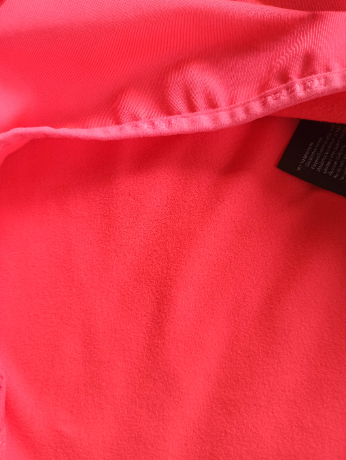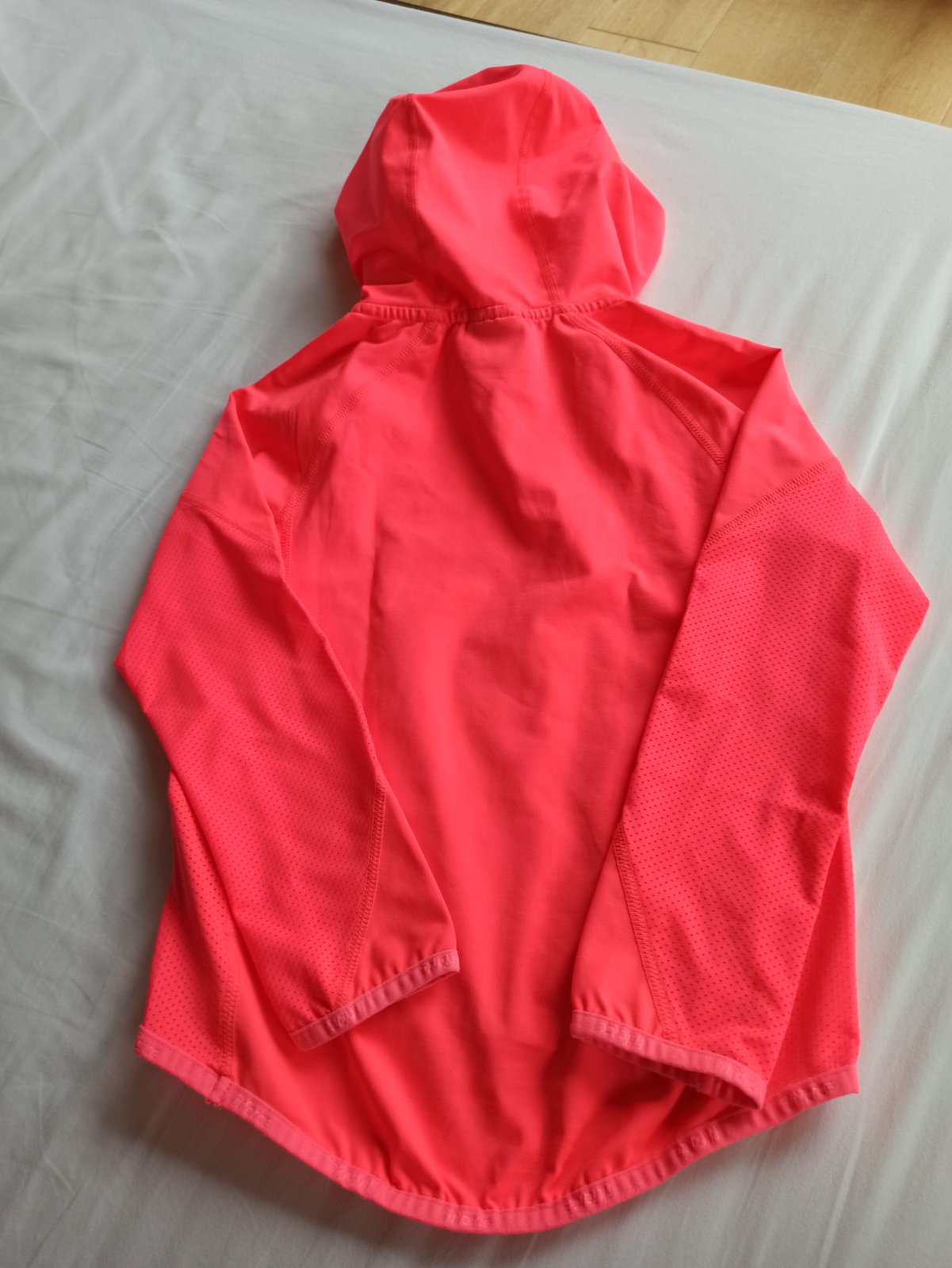 Funkčná mikina neónovo oranžová, nedá sa mi na fotkách dobre zachytiť farba, reálne krajšia, žiarivejšia. V peknom stave len vpredu malý fliačik, na poslednej foto som sa ho snažila zachytiť, ale nedá sa mi to dobre odfotiť, je ho ledva vidieť. Super na leto, ľahko sa dá zbaliť zaberie málo miesta. Z vnútornej strany je taká teplejšia tá látka.