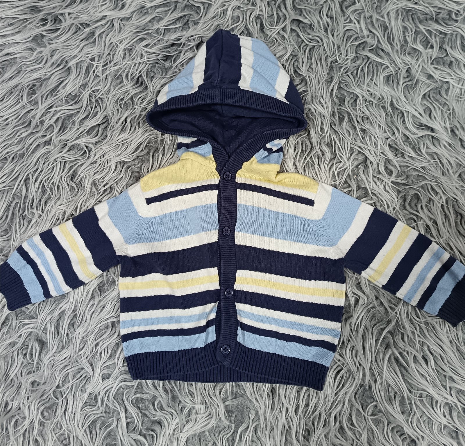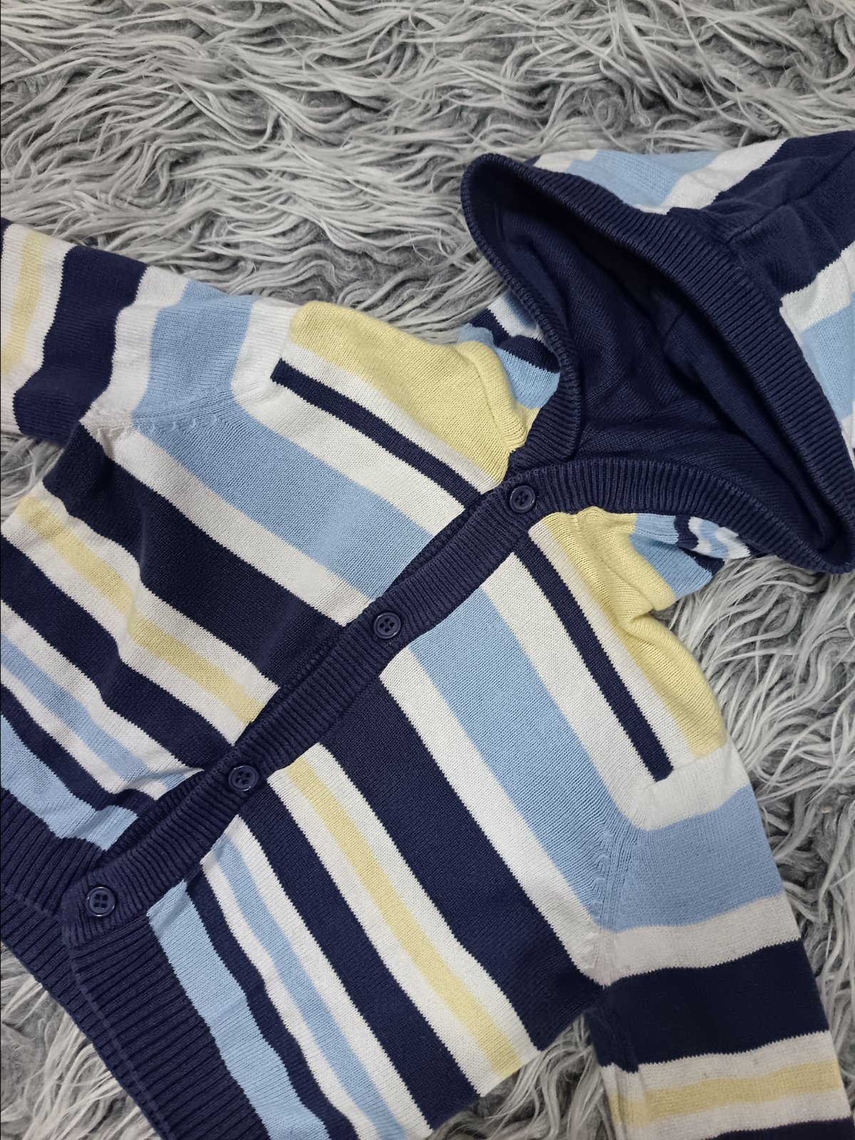Krásný prúžkovaný svetrík s kapucňou v oddtieňoch modrej, veľkosť tak 62/68 nie je veľmi hrubý, je z príjemnej vlny. Svetrík je v peknom nosenom stave