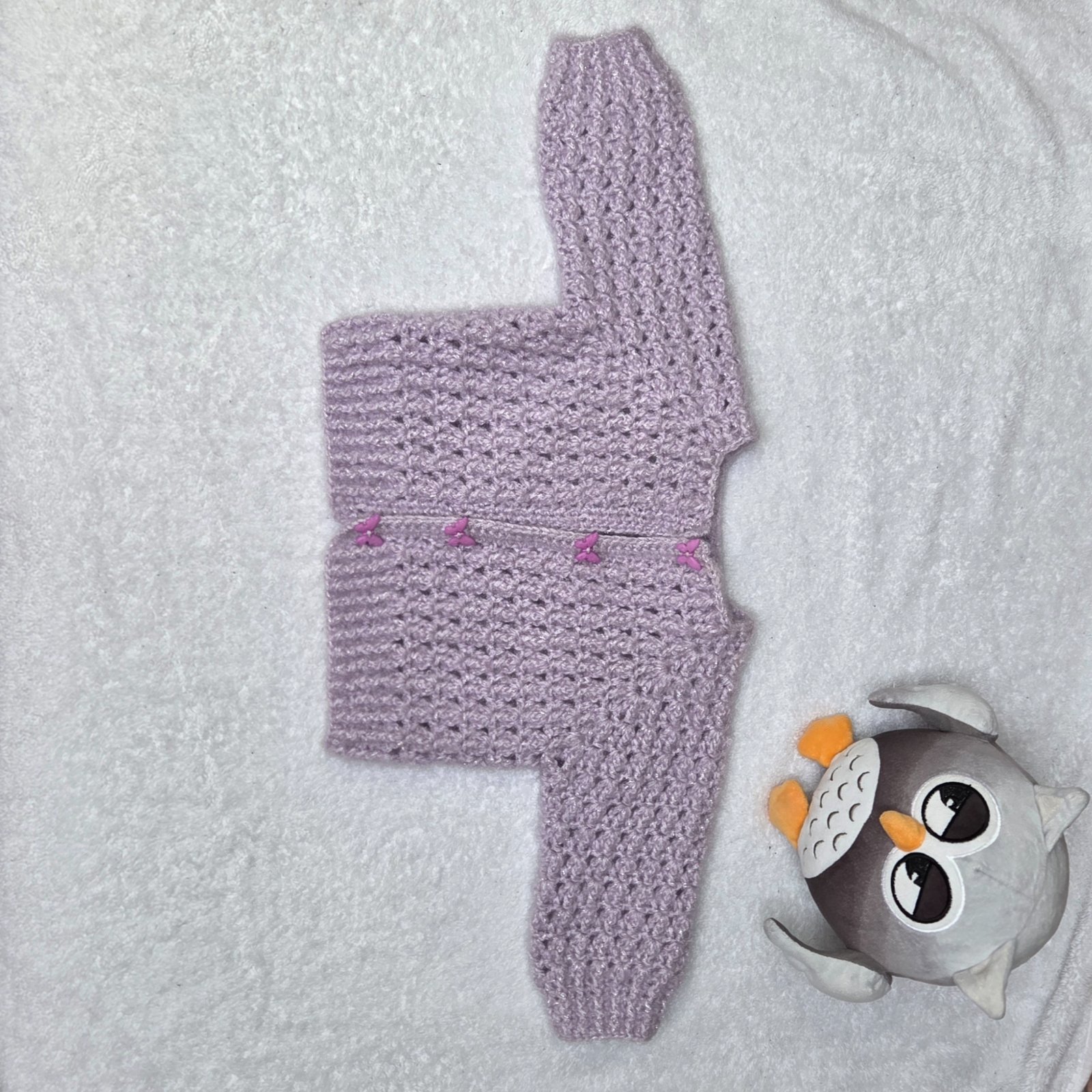 Tento roztomilý dievčenský svetrík je ideálny pre chladnejšie dni. Má krásnu, nežnú fialovú farbu (jemnú orgovánovú/sivofialovú), ktorá dodá každému outfitu sladký a elegantný nádych.