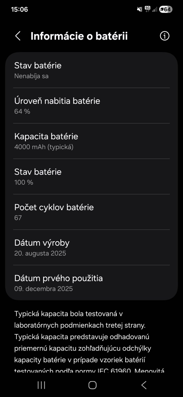 Stav batérie: 100 % zdravie, iba 67 nabíjacích cyklov (minimálne používaný).