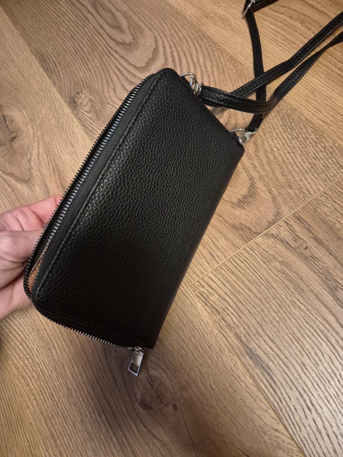 Má odnímateľný dlhý popruh, ktorý nastavíte. Vpredu cvok na zapínanie, priehradka na mobil, po dĺžke je zips a peňaženka má dve samostané priehradky plus na mince.