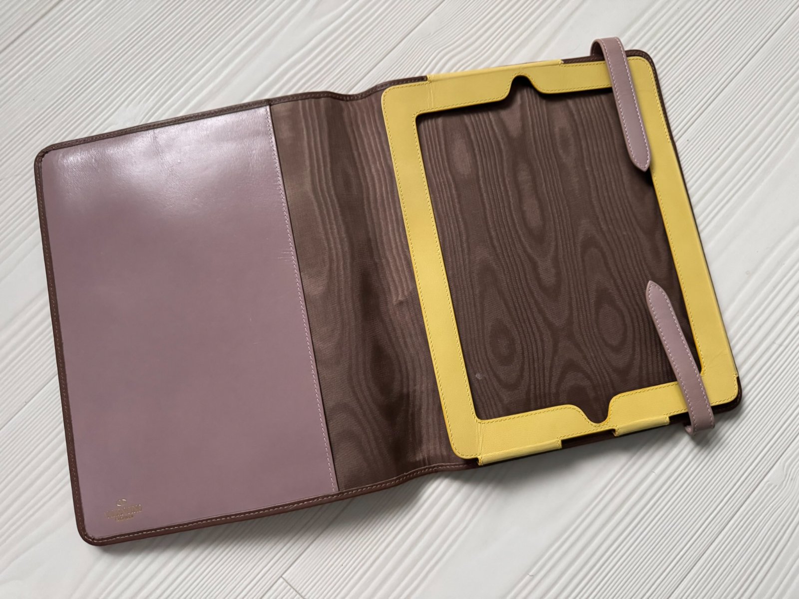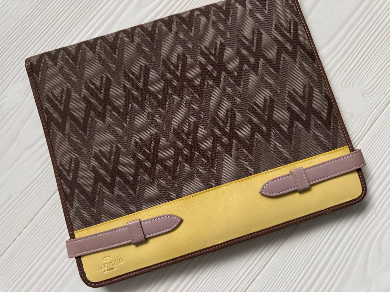 S detailmi v hnedej a žltej farbe a monogramom Valentino, ktorý ponúka toto fantastické puzdro na iPad, tablet, ktoré môžete využiť aj na dokumenty