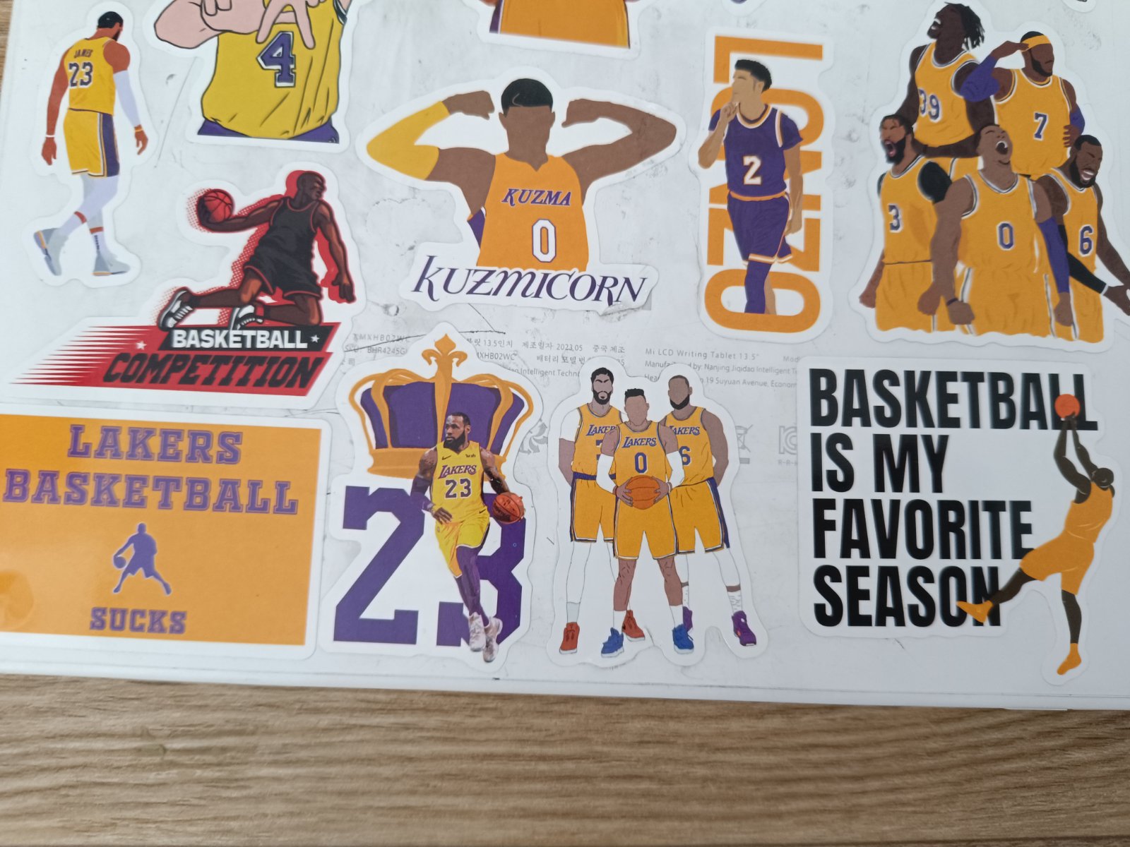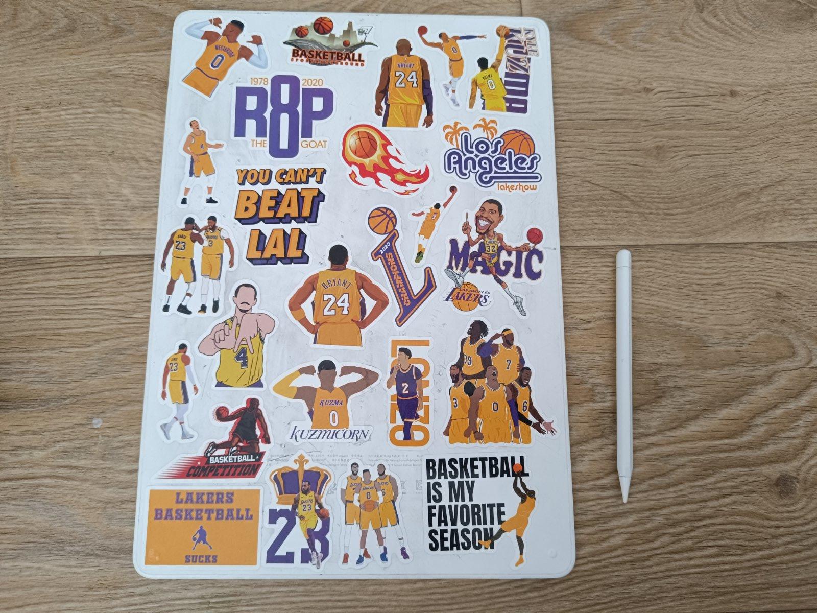 Tablet na písanie, je olepený zo zadnej strany nálepkami.