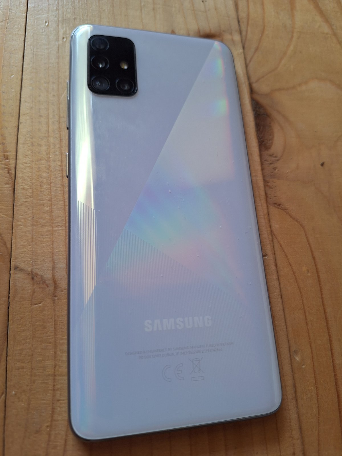 Mobilný telefón Samsung A51, funkčný, bez poškodení (bežné známky používania, neustále v obale). Veľkosť displeja 6,5", pamäť 4GB, úložisko 128 GB. Kapacita batérie 4000 mAh, dual SIM (nano SIM), USB C, radio FM. Rozmery 158,5 x 73,6 x 7,9 mm. 172 g.