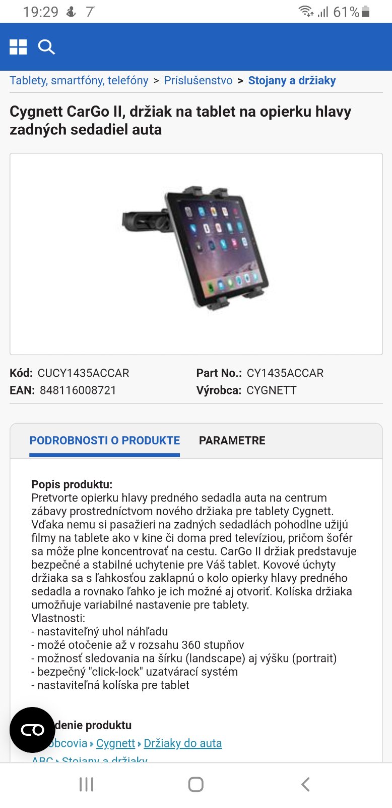 Pretvorte opierku hlavy predného sedadla auta na centrum zábavy prostredníctvom nového držiaka pre tablety Cygnett. Vďaka nemu si pasažieri na zadných sedadlách pohodlne užijú filmy na tablete ako v kine či doma pred televíziou, pričom šofér sa môže plne koncentrovať na cestu. CarGo II držiak predstavuje bezpečné a stabilné uchytenie pre Váš tablet. Kovové úchyty držiaka sa s ľahkosťou zaklapnú o kolo opierky hlavy predného sedadla a rovnako ľahko je ich možné aj otvoriť. Kolíska držiaka umožňuje variabilné nastavenie pre tablety.