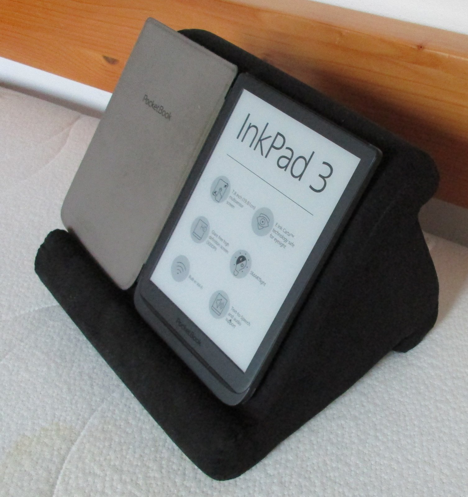 plnene pevnou penou (ako matrace), zaroven makke na dotyk, teda vhodne na pouzitie kdekolvek - aj v posteli, na sedacke. V profile ma naklonena plocha 3 rozne sklony, viete si najst ten vhodny pre seba. Stojan resp. podlozka na tablet, citacku eknih - bol 1x pouzity, je bez poskodeni. Cierna latka povrchom imitujuca brusenu kozu je syta po celej ploche, bez chybicky.