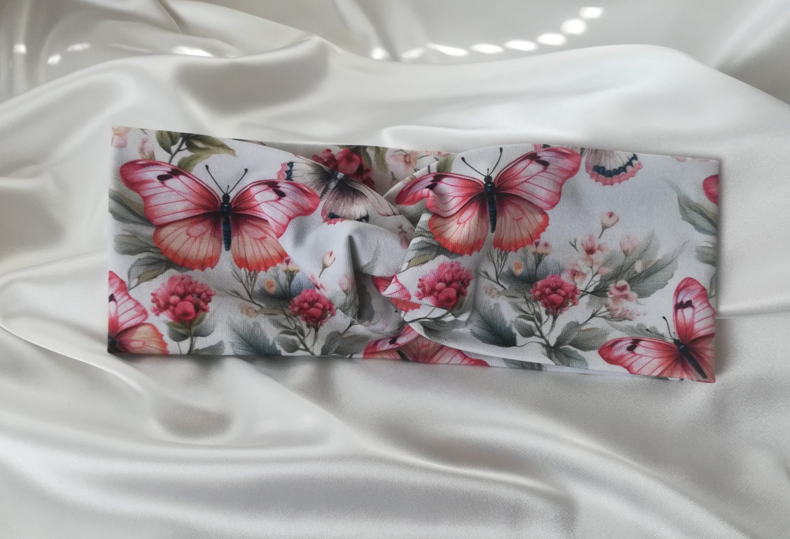 SkladomNová twist/vpredu prekrížená čelenka z nádherného dizajnérského úpletu v bielej farbe s motýlikmi a kvietkami.