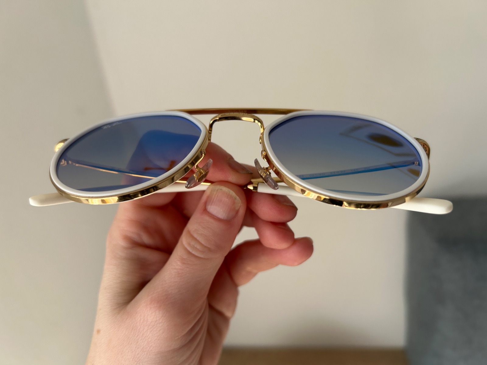 Veľmi pekné, zlatá v kombinácii s bielou. Kupované v kamennej predajni Mania optik. Vymenené plastové záušnice, tie sa uvoľňovali od nova. Vnútorná rozteč 13,2 cm v najužšom bode. Ale sedia aj na ú...