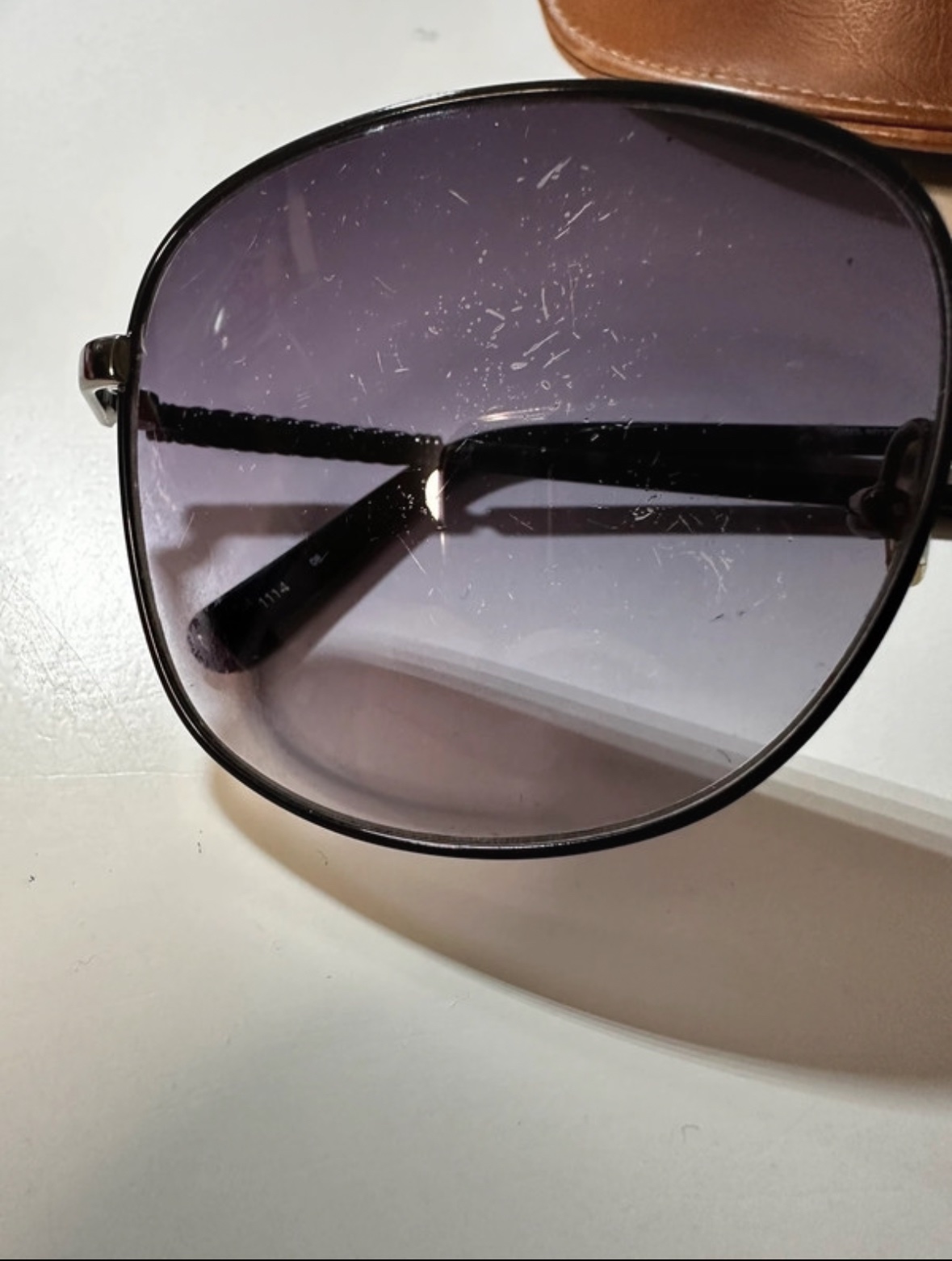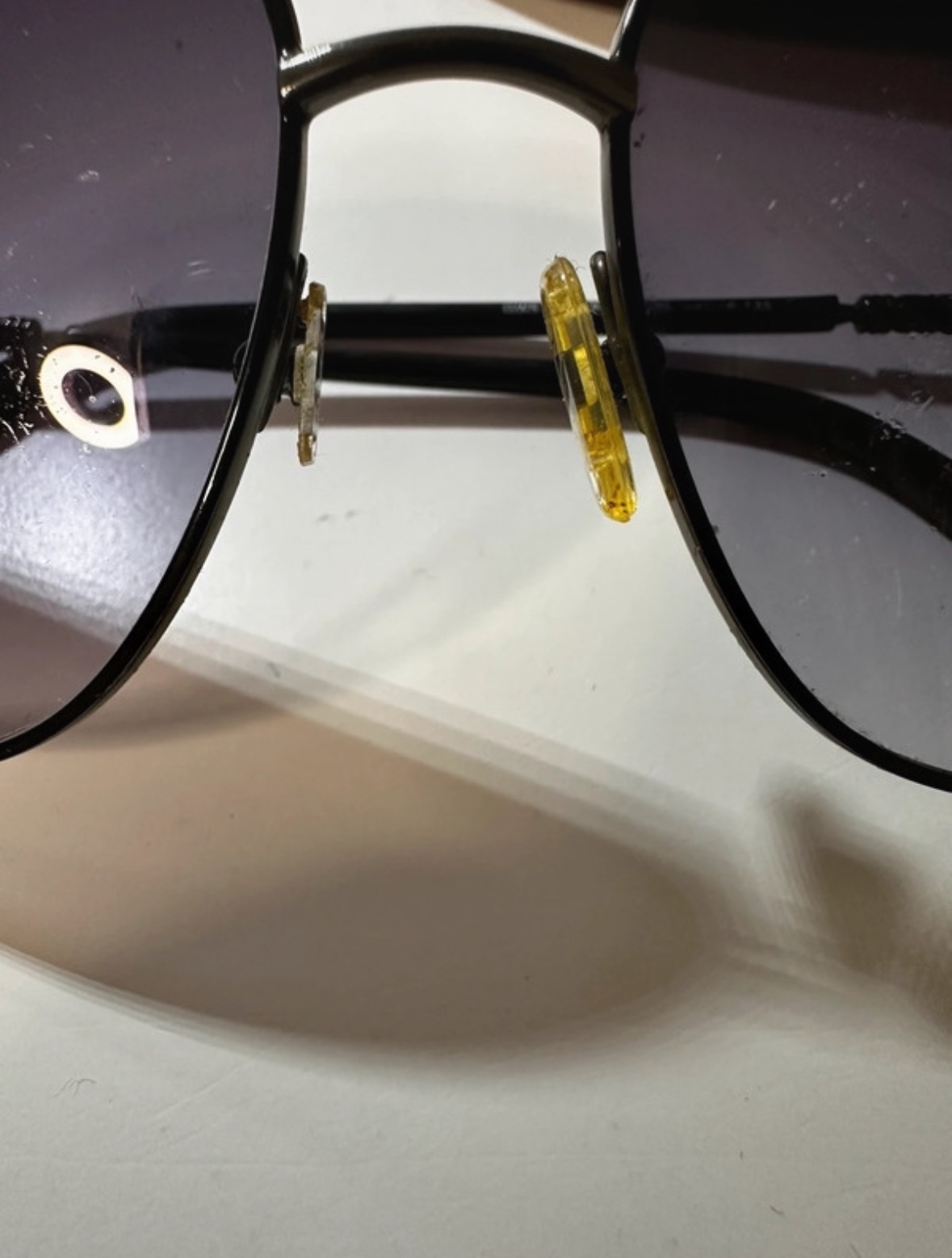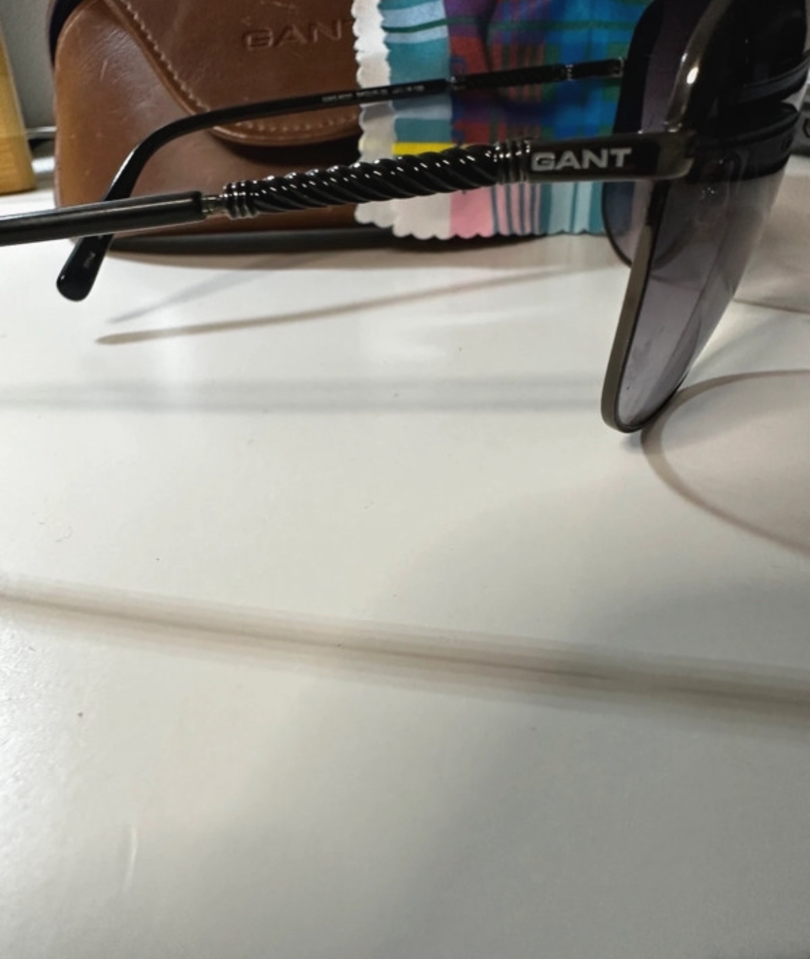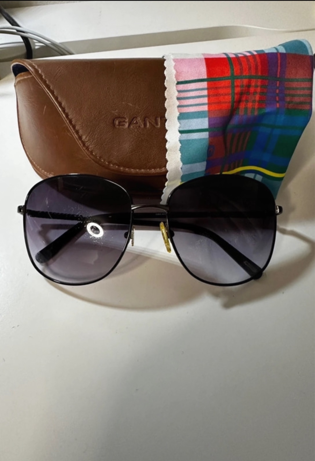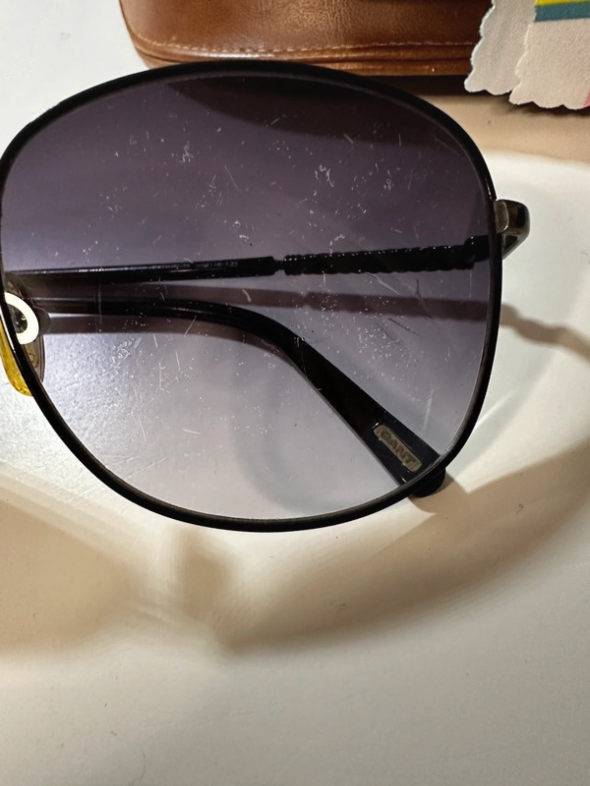 Predávam čierne dámske okuliare značky GANT. Okuliare sú vo veľmi dobrom stave, ale majú mierne škrabance na sklách, ktoré však neovplyvňujú výhľad. Chýba jedna z malých „nosových podložiek“.