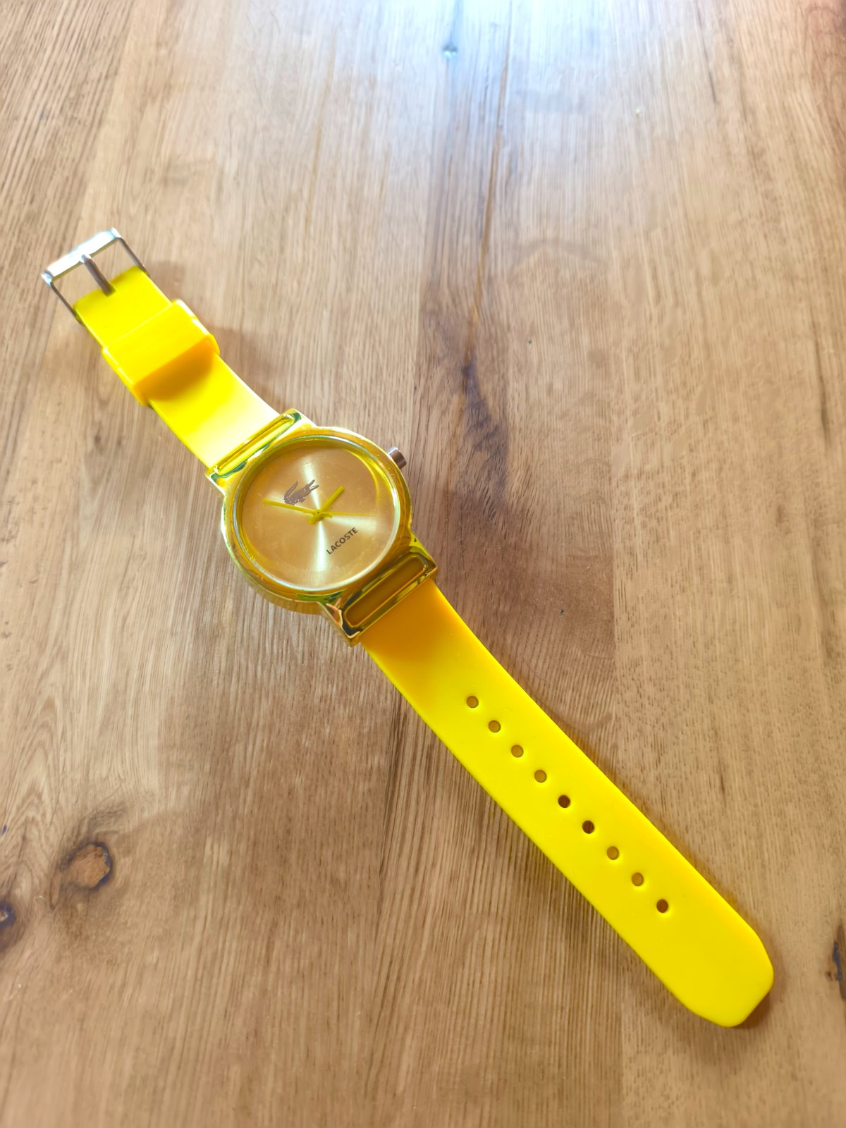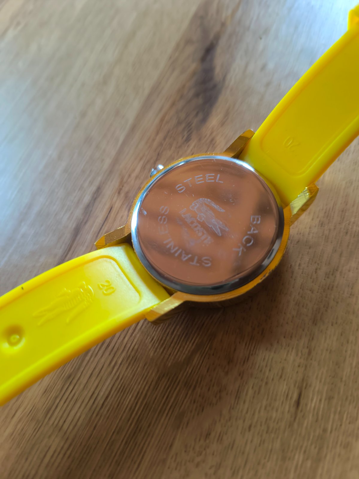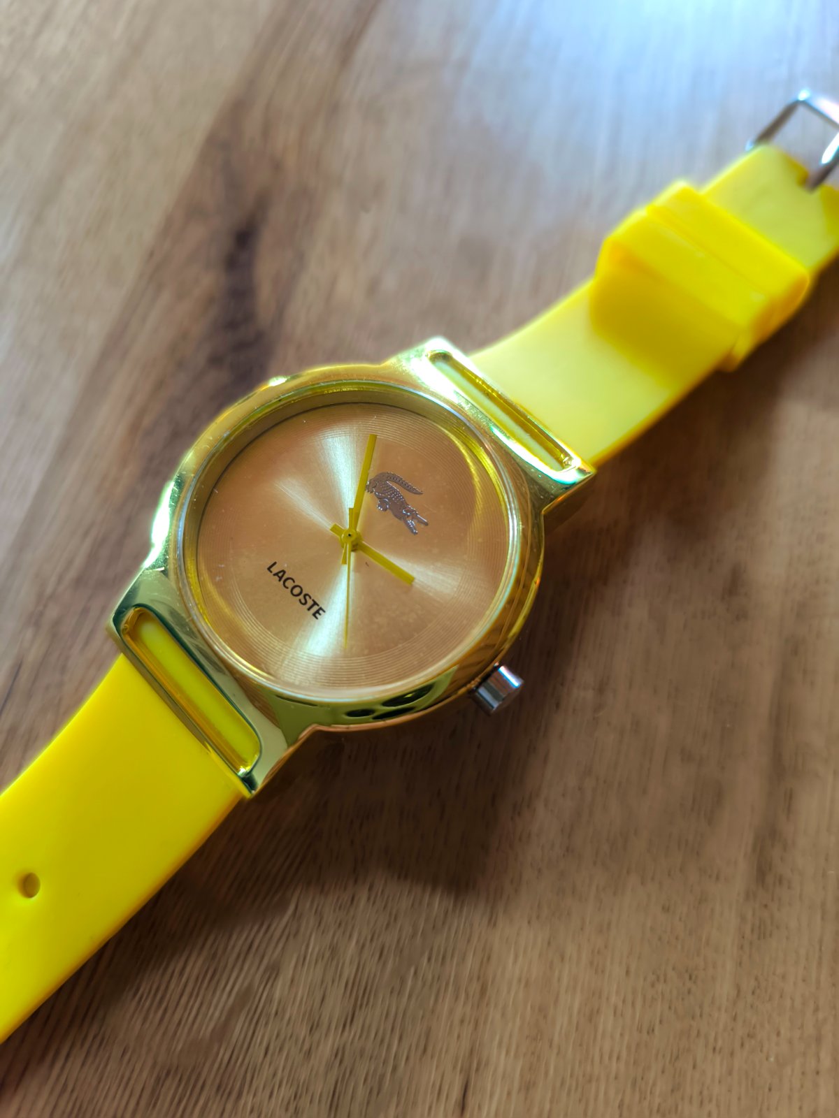 Moderné praktické hodinky Lacoste s gumeným naramkom, a teda veľmi dobre udržiavateľné a cistiteľné. Metalické okolie ciferníka. Minimálne nosené, len párkrát, super stav. Treba ale vymeniť baterku.