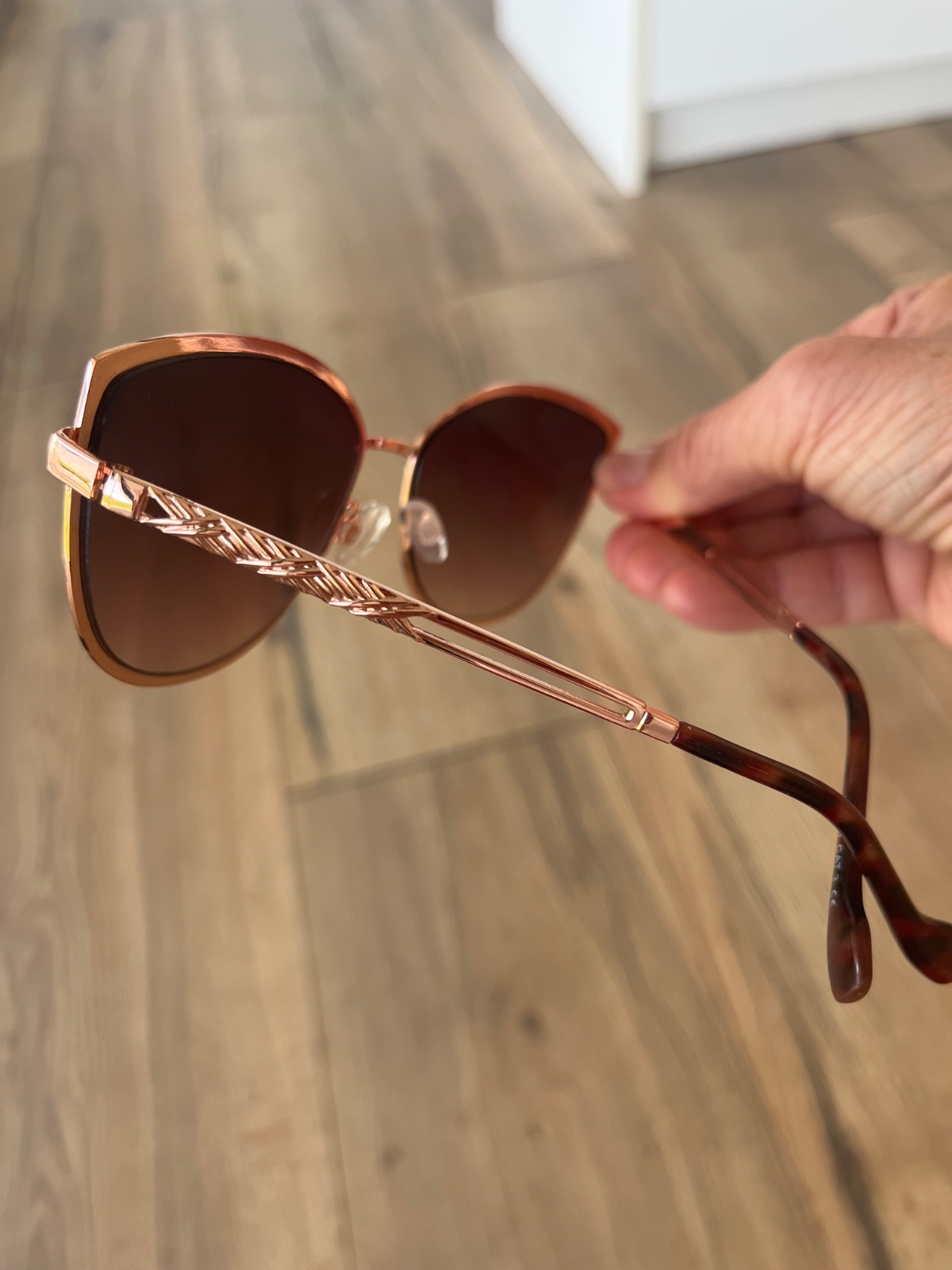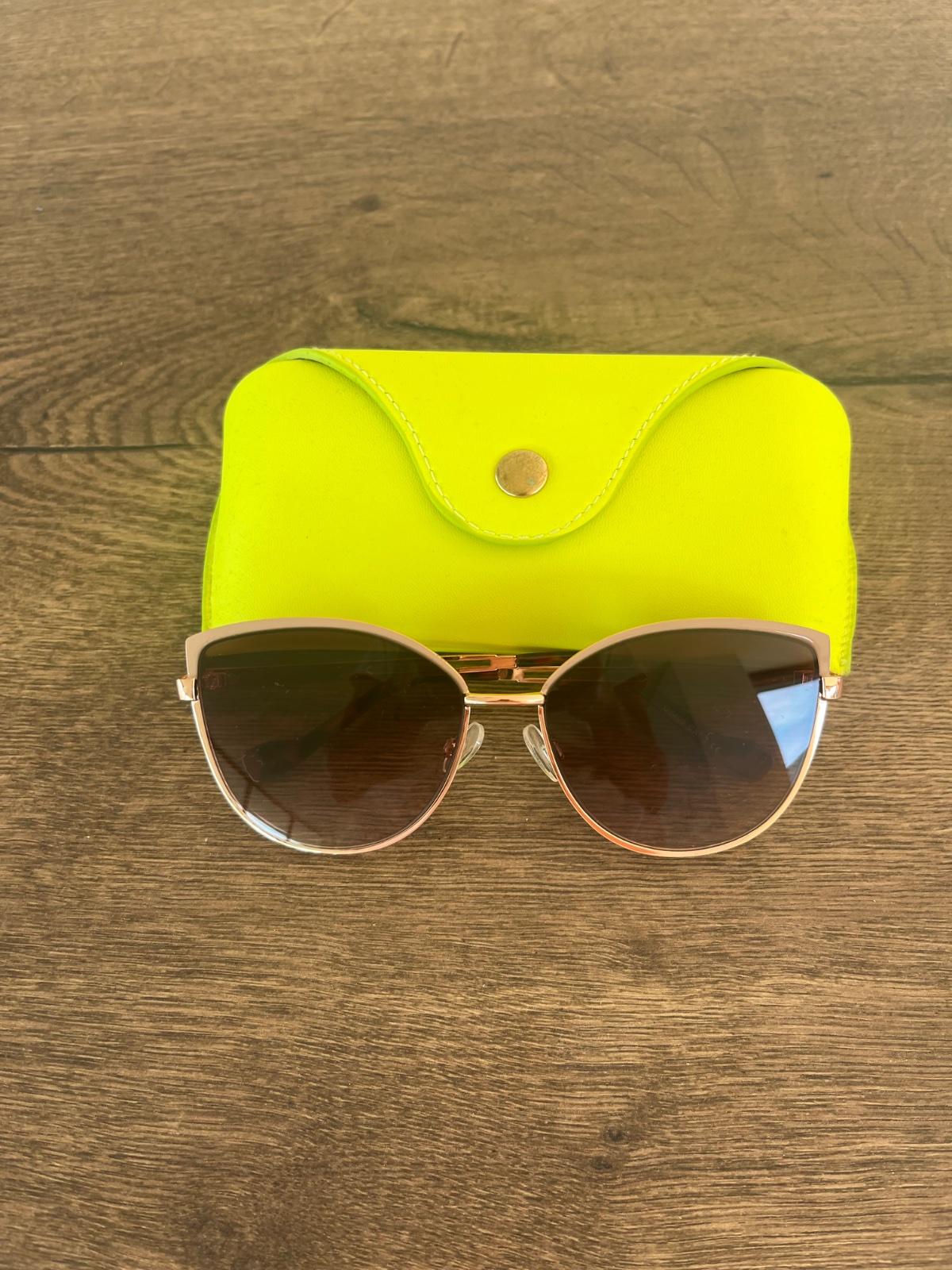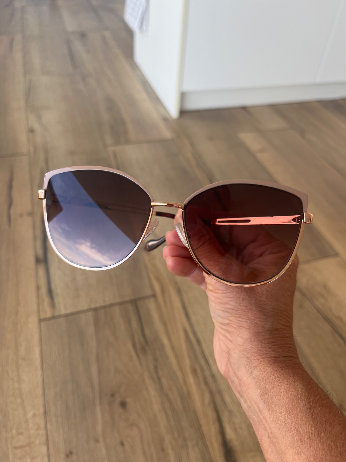Predám štýlové slnečne okuliare kupene v CCC farba rámu pudrovoruzova nožičky zlate a skla hnedé duhovane veľmi pekne a dobre sedia + púzdro - obe stav ako nové / použité max 1x