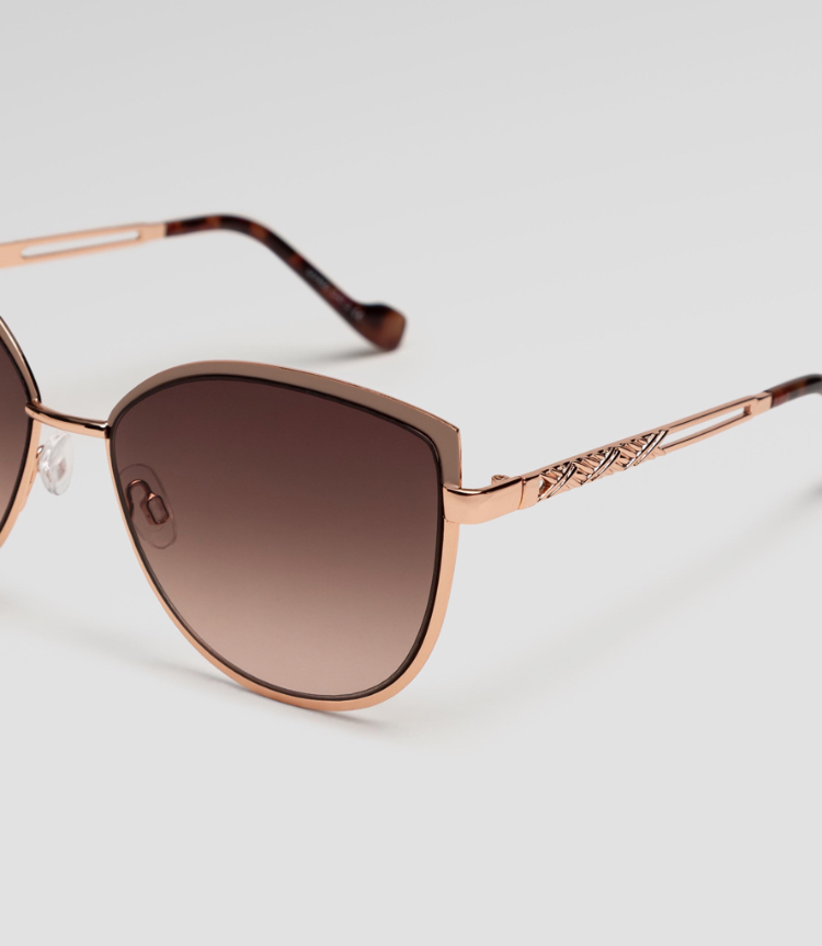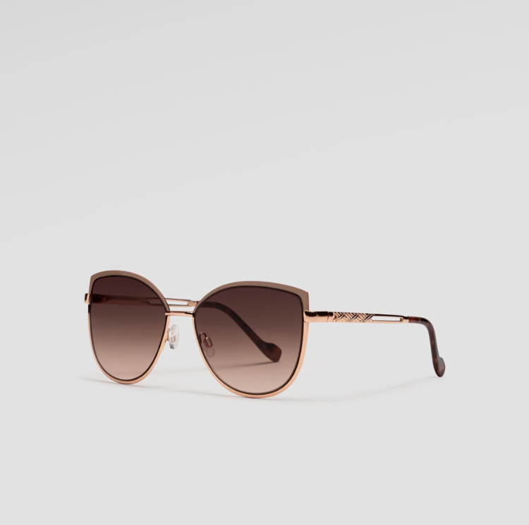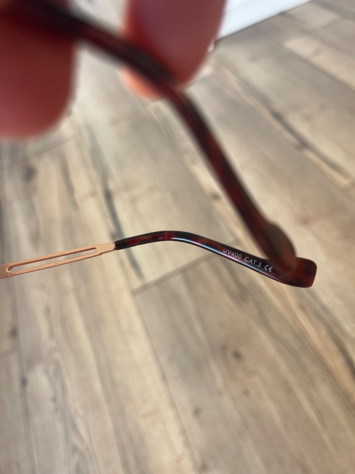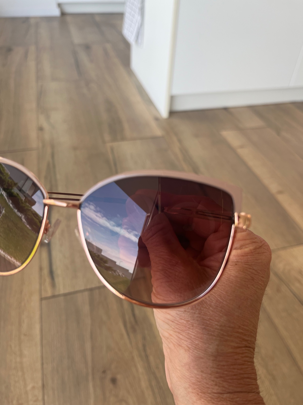 Predám štýlové slnečne okuliare kupene v CCC farba rámu pudrovoruzova nožičky zlate a skla hnedé duhovane veľmi pekne a dobre sedia + púzdro - obe stav ako nové / použité max 1x