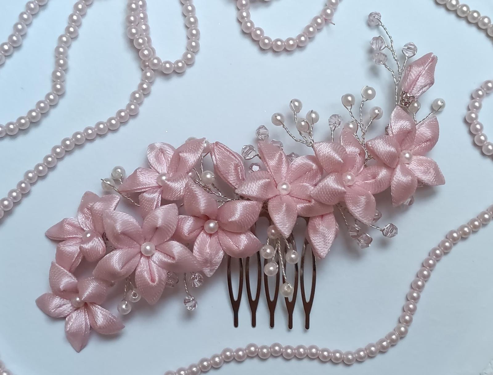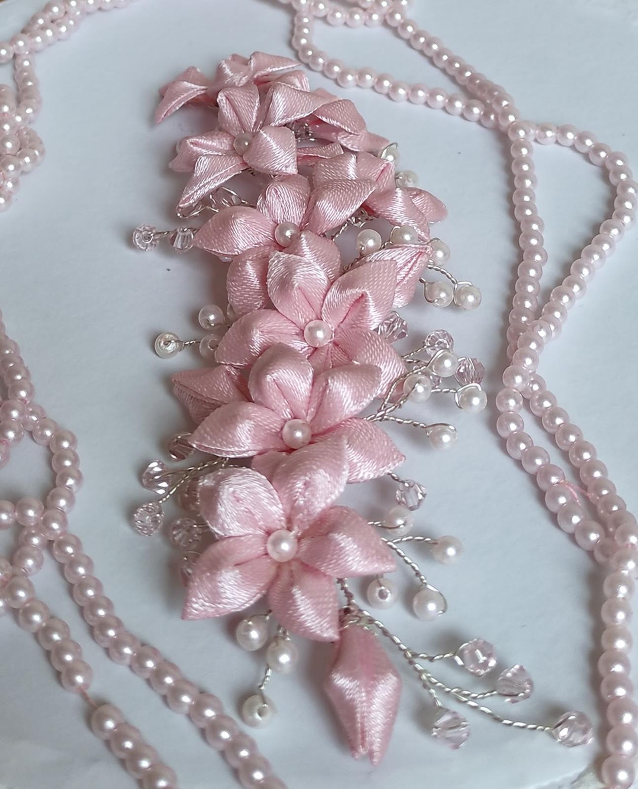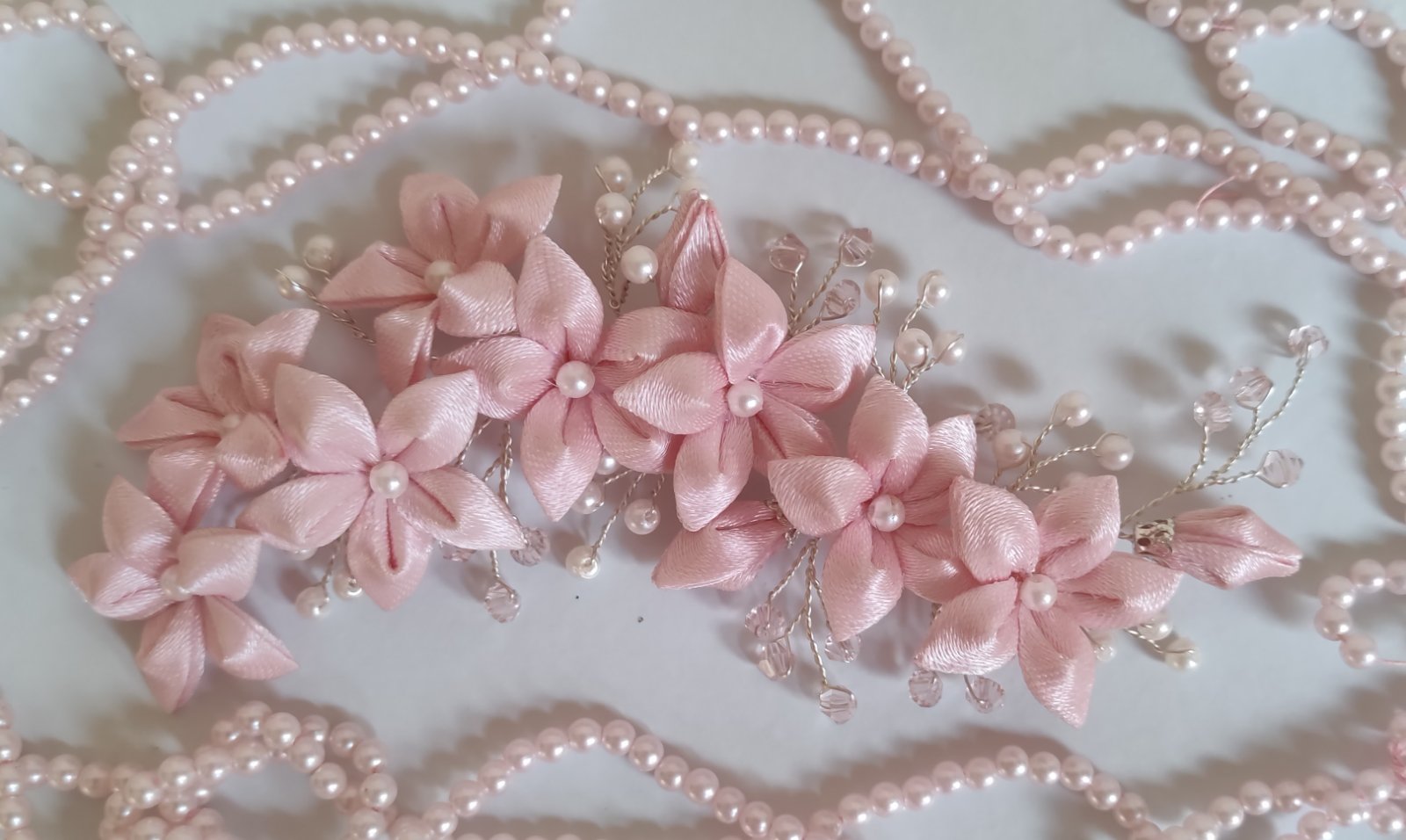 Doprajte svojim vlasom jemnosť a pôvab s touto ručne vyrobenou ozdobou zo saténových ľalií a púčikov, zdobenou sklenenými a akrylovými korálikmi.